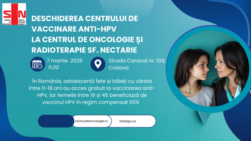 Vineri, 7 martie, are loc inaugurarea Centrului de Vaccinare anti-HPV în cadrul Centrului de Oncologie și Radioterapie Sf. Nectarie, situat pe Strada Caracal nr. 109 din Craiova.