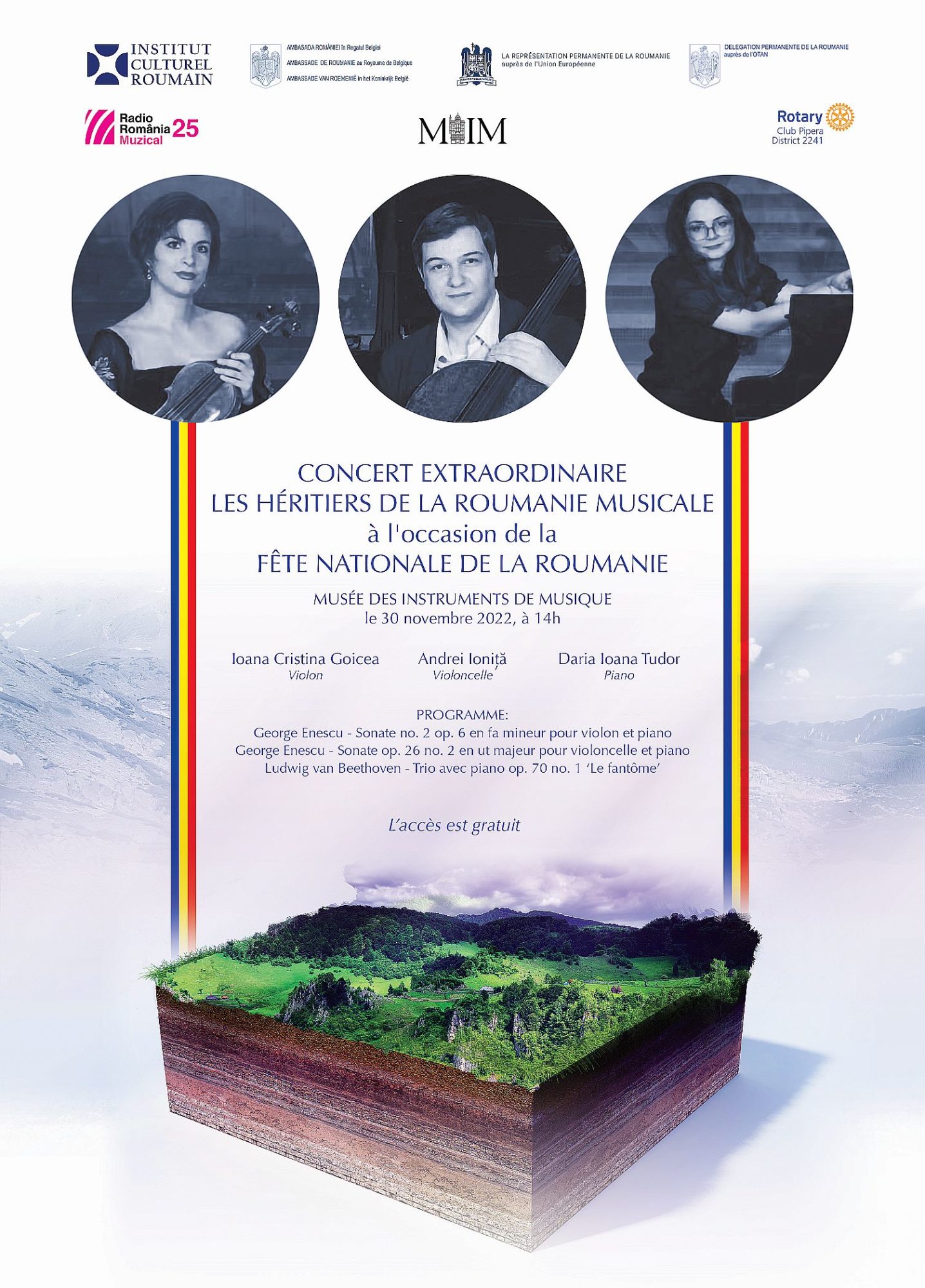 Violonista Ioana Cristina Goicea, violoncelistul Andrei Ioniță și pianista Daria Tudor – trei dintre cei mai cunoscuți și apreciați muzicieni români ai momentului, la nivel internațional – susțin un concert cameral extraordinar, la Bruxelles, prilejuit de sărbătorirea Zilei Naționale a României. Evenimentul va avea loc miercuri, 30 noiembrie, la ora 14.00, în sala de concerte a emblematicului Muzeu al Instrumentelor Muzicale de la Bruxelles (MIM), în inima orașului ce găzduiește instituțiile reprezentative ale Uniunii Europene. Concertul se desfășoară sub emblema proiectului “Moștenitorii României muzicale”, unul dintre cele mai vizibile programe de promovare a tinerilor muzicieni români.