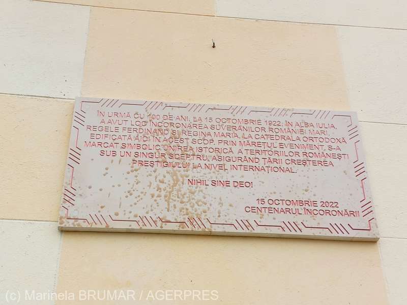 „În urmă cu 100 de ani, la 15 octombrie 1922, în Alba Iulia, a avut loc încoronarea suveranilor României Mari, Regele Ferdinand şi Regina Maria, la Catedrala Ortodoxă edificată aici în acest scop. Prin măreţul eveniment, s-a marcat simbolic unirea istorică a teritoriilor româneşti sub un singur sceptru, asigurând ţării creşterea prestigiului la nivel internaţional. Nihil Sine Deo! 15 octombrie 2022 – Centenarul Încoronării” – se poate citi pe placa binecuvântată de arhiepiscopul Irineu.