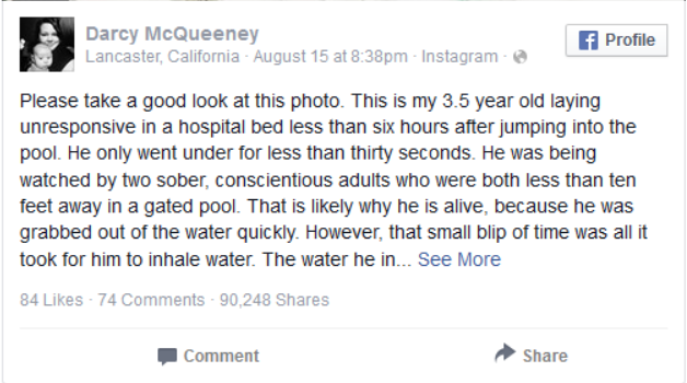 Darcy McQueeney, mama unui băiețel de trei ani și jumătate, a trecut prin clipe de coșmar, în momentul în care copilul ei rămas fără cunoștință, la mai bine de șase ore după un accident la piscină.