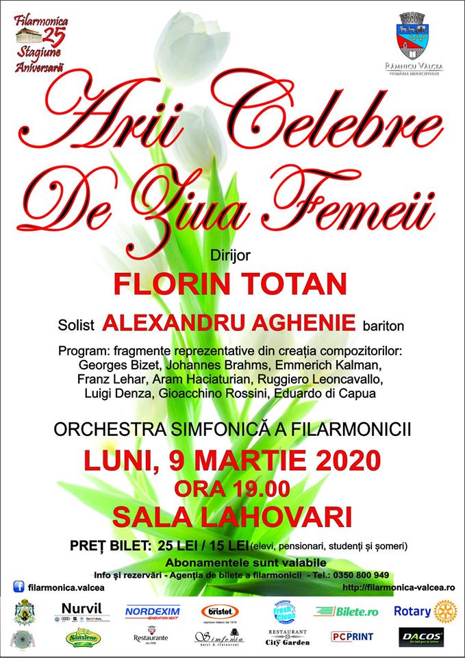 Astăzi, 9 martie, Filarmonica „Ion Dumitrescu” din Râmnicu Vâlcea marchează Ziua Femeii, printr-un concert prezentat sub genericul ,,Arii celebre de ziua femeii”. Concertul va avea loc în sala Lahovari, de la ora 19:00.