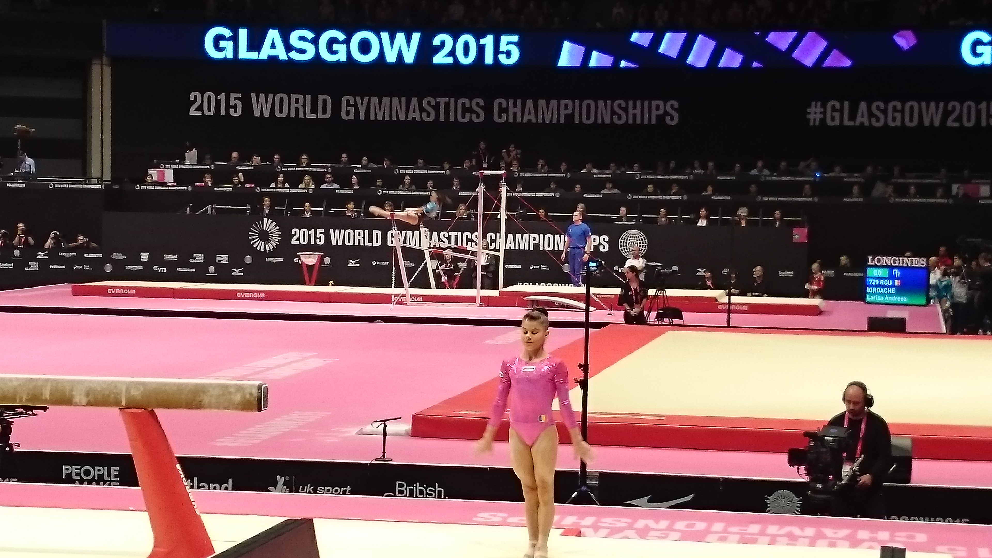 Larisa Iordache a deschis concursul la bârnă cu o evoluție curată pentru un 14.766 notă care a rămas cea mai bună din concurs și care a propulsat-o pe locul 7 după prima rotație. Solul i-a adus un 14.475 și locul 5 în ierarhia provizorie, în condițiile în care sportivele din grupa favoritelor dominau clasamentul general.