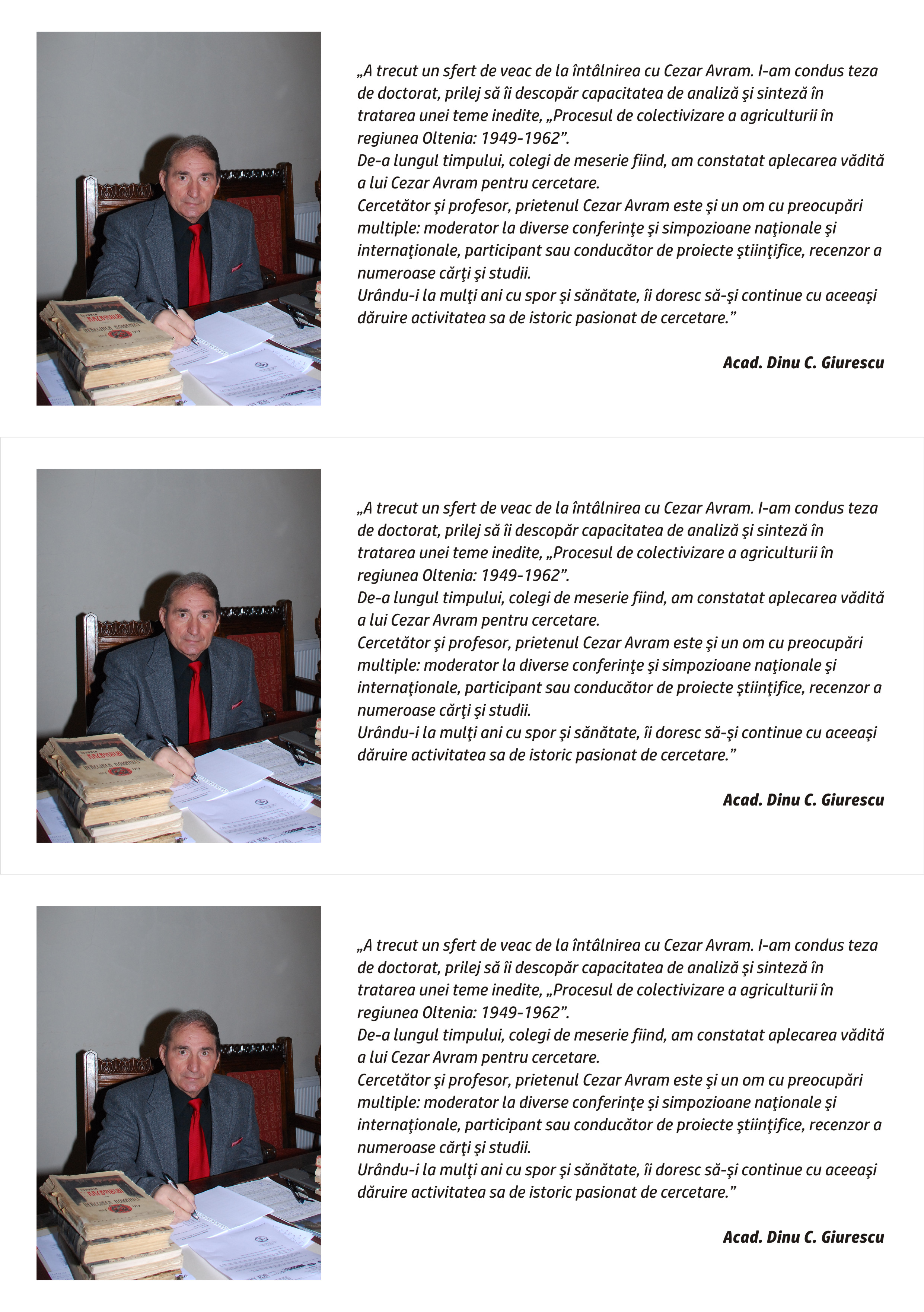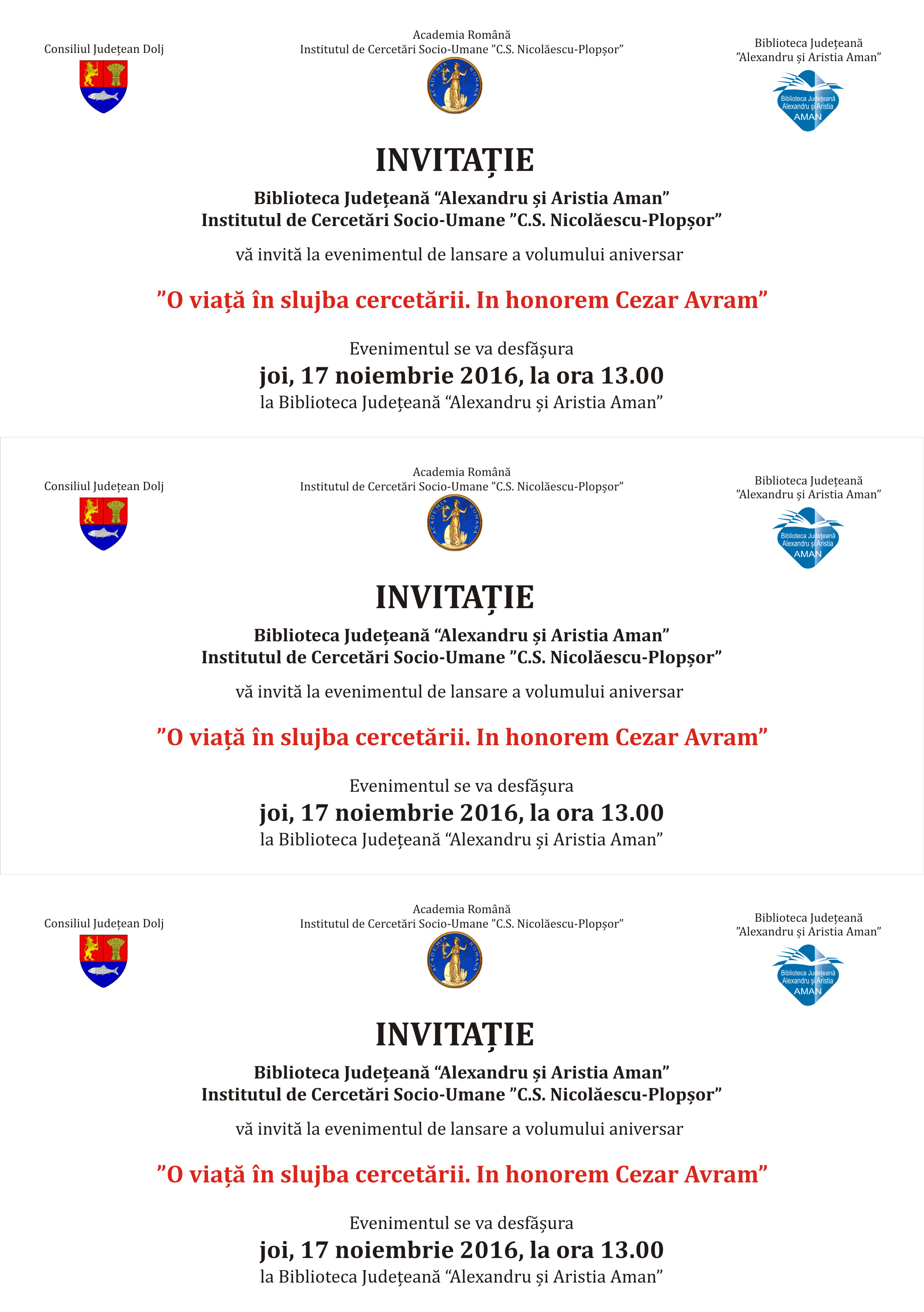 Biblioteca Județeană „Alexandru și Aristia Aman” alături de Institutul de Cercetări Socio-Umane „C.S. Nicolăescu-Plopșor” vă invită la aniversarea împlinirii a 70 de ani de viața și 44 de ani de activitate didactică și de cercetare în științele umaniste și sociale a prof. univ. dr. Cezar Avram.