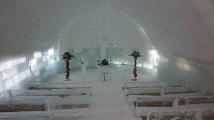 La fel ca la Hotelul de gheață, la construcția bisericii s-au folosit blocuri de gheață tăiate din gheața care acoperă Lacul Bâlea, iar în loc de mortar, un amestec de zăpadă și apă, care ulterior îngheață. În interior , Biserica de gheață a fost decorată cu sculpturi religioase în zăpadă și gheață, un crucifix masiv și Cina cea de taină, sculptată pe peretele lăcașului de cult.