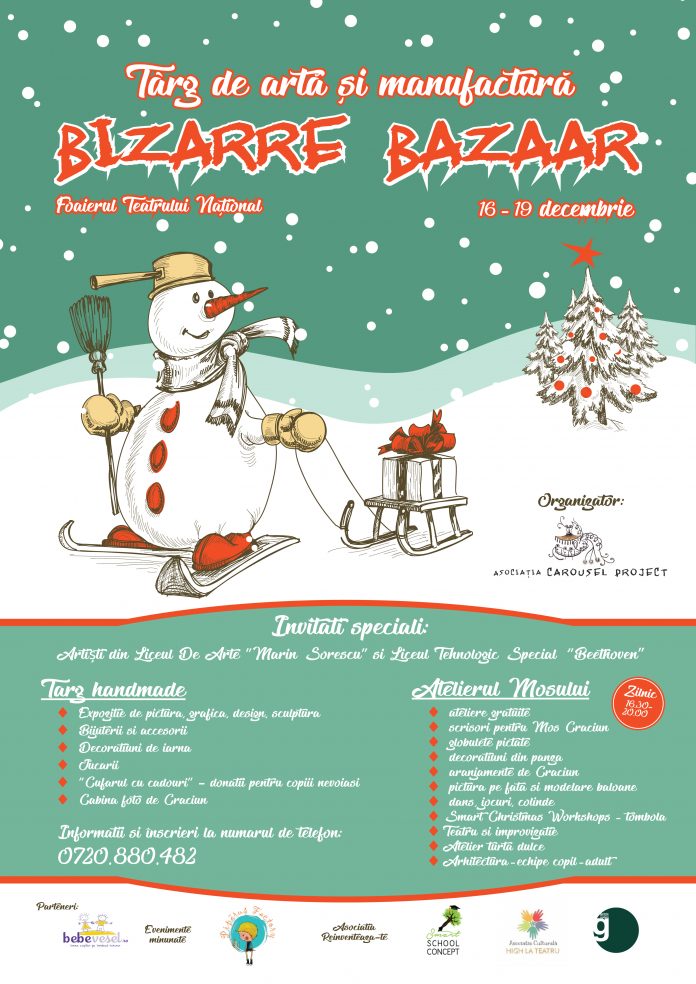 A doua parte a Târgului de artă și manufactură Bizarre Bazaar are loc în perioada 16 – 19 decembrie, în foaierul Teatrului Național „Marin Sorescu” din Craiova. Veți putea întâlni creații noi si originale de pictură, grafică, sculptură, semnate de mulți tineri talentați ai Craiovei, elevi la Liceul de Arte „Marin Sorescu” și Liceul Tehnologic „Beethoven” – invitați speciali.