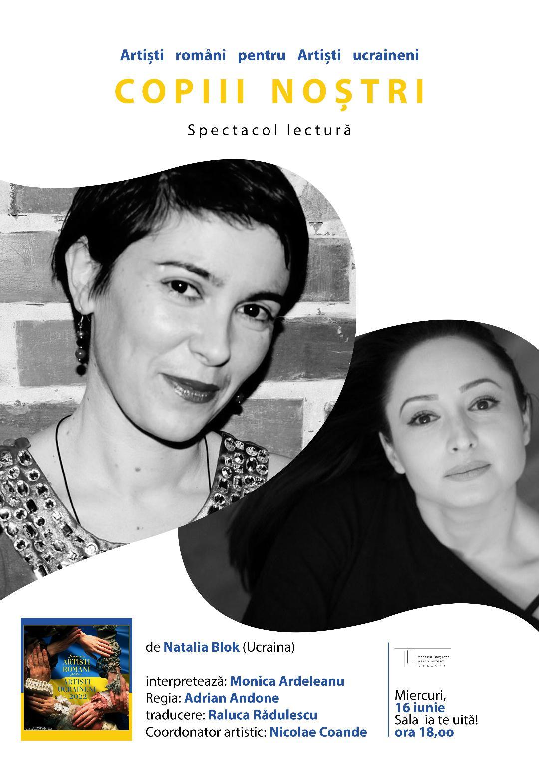 Pe 15 iunie, ora 18.00, la sala Ia te uită! a Naționalului craiovean, are loc spectacolul-lectură ”Copiii noștri”, în interpretarea actriței Monica Ardeleanu.