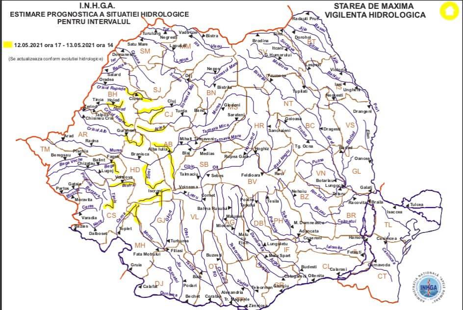 În intervalul 12.05.2021 ora 17:00 – 13.05.2021 ora 14:00 pe râurile din bazinele hidrografice: Cerna – bazin superior şi afluenţi bazin mijlociu şi inferior (judeţele: Gorj şi Caraş Severin), Jiu – bazin superior amonte S.H. Sadu şi afluenţii aferenţi sectorului aval S.H. Sadu – amonte S.H. Rovinari (judeţele: Hunedoara şi Gorj) şi Motru – bazin superior şi afluenţi bazin mijlociu şi inferior (judeţele: Gorj şi Mehedinţi).