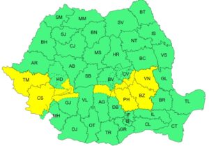 Vântul va sufla cu putere în mai multe regiuni ale țării. În sud-vest și est sunt așteptate rafale de 40–50 km/h, iar pe crestele montane acestea pot depăși 90 km/h. Un cod galben distinct este în vigoare pe parcursul zilei de miercuri pentru județul Caraș-Severin și zone din Timiș, unde vântul va atinge viteze de 70 km/h, iar în Munții Banatului și vestul Carpaților Meridionali se pot înregistra rafale de până la 100 km/h.