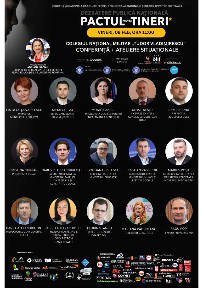Vineri, 9 februarie, Confederația Națională pentru Antreprenoriat Feminin, pe scurt – CONAF, a organizat la Craiova, la Colegiul Național Militar ”Tudor Vladimirescu, cea de-a zecea dezbatere de  la nivel național în cadrul programului național pentru reducerea abandonului școlar „Pactul Pentru Tineri”- ediția a II-a.
