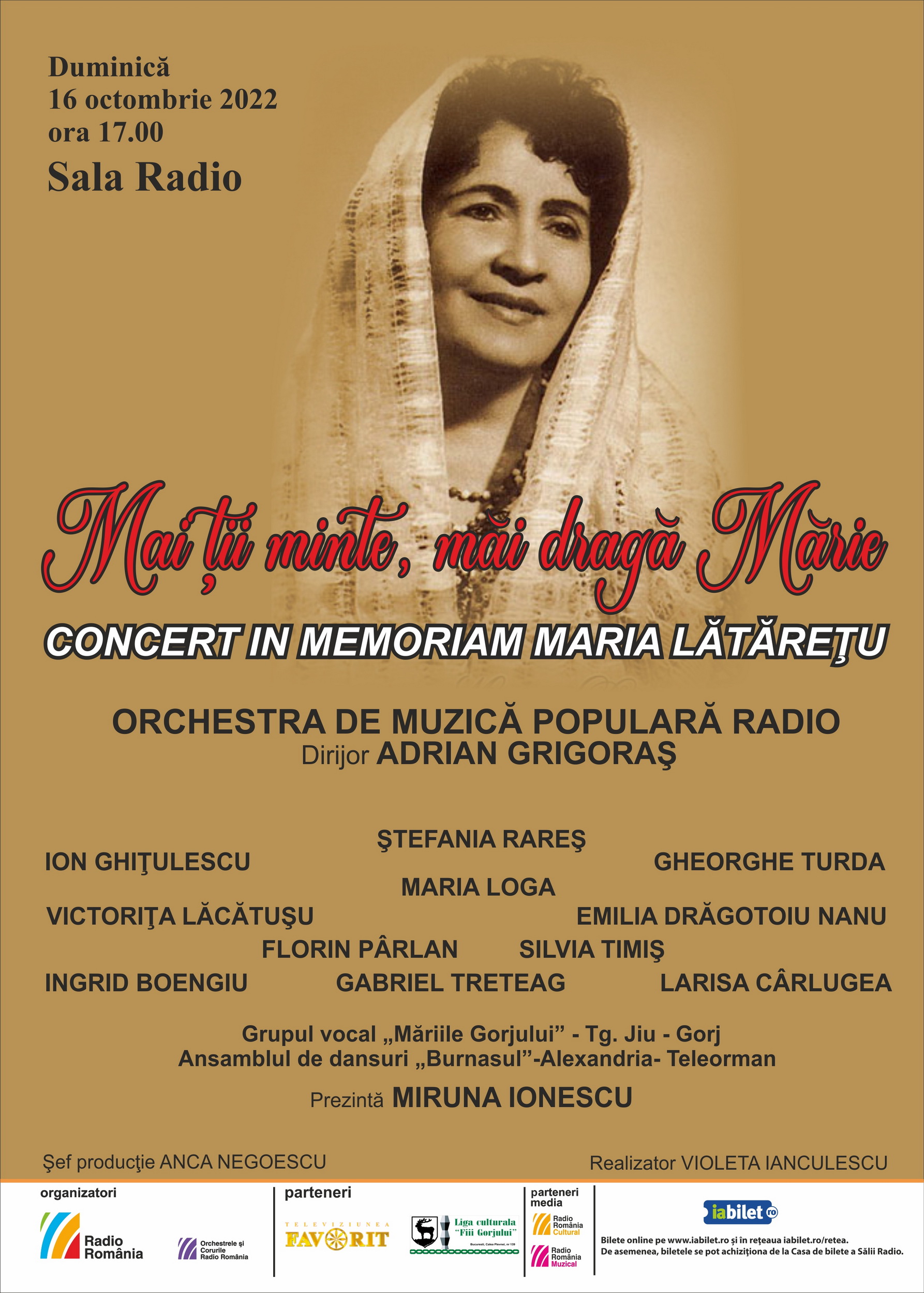 Un concert încărcat de emoţie, o seară de suflet, eveniment în care alături de Orchestra De Muzică Populară Radio – dirijată de Adrian Grigoraș – vor urca pe scenă: Ştefania Rareş, Ion Ghiţulescu, Gheorghe Turda, Maria Loga, Victoriţa Lăcătuşu, Emilia Drăgotoiu Nanu, Florin Pârlan, Silvia Timiş, Ingrid Boengiu, Gabriel Treteag, Larisa Cârlugea, Grupul Vocal Măriile Gorjului- Târgu Jiu (Gorj), Ansamblul de dansuri Burnasul- Alexandria (Teleorman).