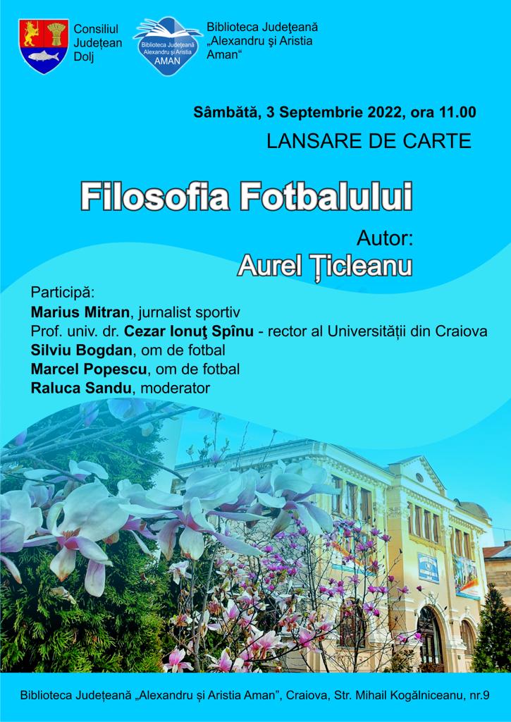 Una dintre marile glorii ale Craiovei Maxima, Aurel Țicleanu, va lansa, sâmbătă, 3 septembrie, cartea ”Filosofia fotbalului”. Evenimentul va fi găzduit de Biblioteca Județeană „Alexandru și Aristia Aman”, în sala „Acad. Dinu C. Giurescu”, de la ora 11.00.