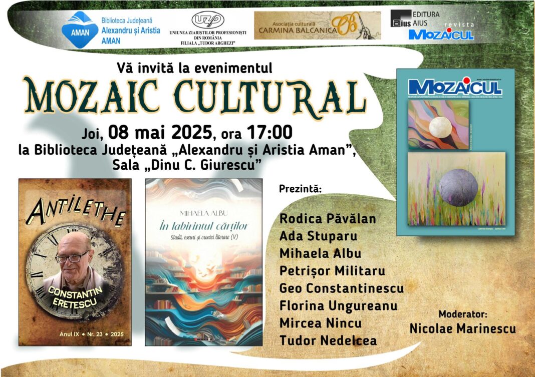 Biblioteca Județeană „Alexandru și Aristia Aman” din Craiova găzduiește joi, 8 mai, începând cu ora 17.00, evenimentul „Mozaic Cultural”, în cadrul căruia vor fi lansate cele mai recente numere ale revistelor Antilethe si Mozaicul.