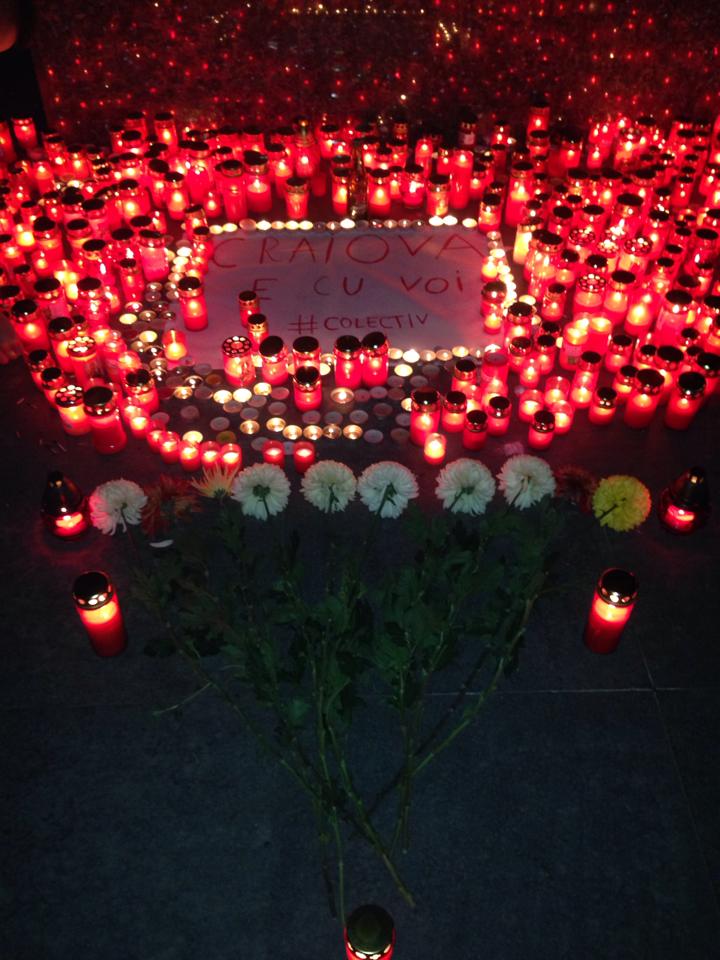 La Craiova a avut loc duminica seara, 1 noiembrie, un mars de solidaritate in Piata Mihai Viteazul. Craiovenii au venit in numar mare, au aprins o lumanare si au adus flori pe care le-au depus in memoria victimelor tragicului incendiu. „Craiova e cu voi #colectiv” este mesajul pe care cei prezenti in Piata Mihai Viteazul l-au transmis catre toti cei afectati de evenimentul ce a indoliat o tara intreaga.