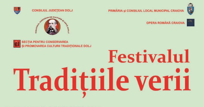 La Craiova, sâmbătă, 19 iulie, la Teatrul de vară din Parcul „Nicolae Romanescu“, de la ora 11.00, are loc Festivalul „Tradiţiile verii“ – ediţia a XIII-a. Ansambluri și soliști din judeţele Dolj și Olt vor aduce pe scenă obiceiurile și tradițiile care spun de sute de ani povestea verilor în plaiurile oltenești. Vor fi prezentate obiceiuri precum Sânzienele sau Drăgaica, Paparudele sau Primul colac, obiceiuri de Sfântul Ilie și de seceriș, într-o atmosferă de sărbătoare, însuflețită de cântecul și jocul popular.