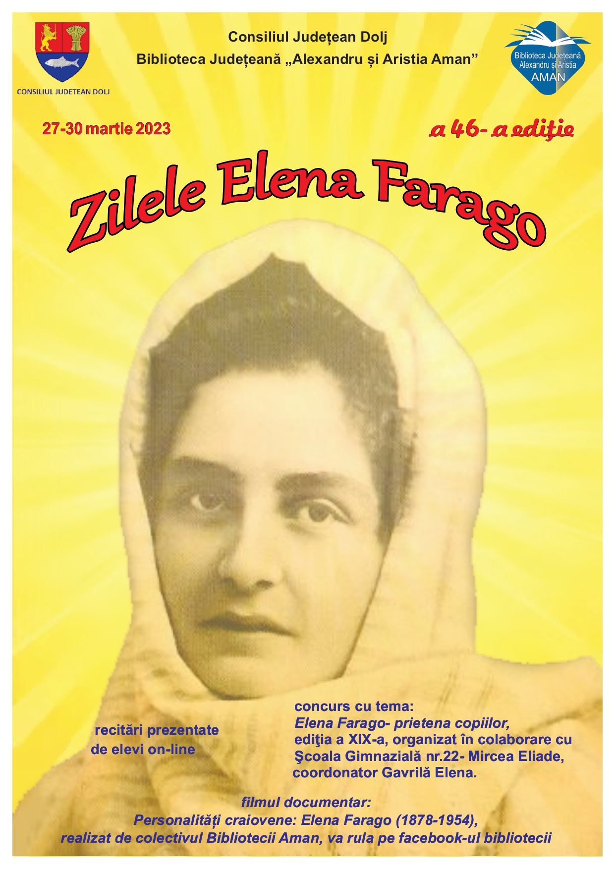 Biblioteca Județeană „Alexandru și Aristia Aman” organizează, în perioada 27 – 30 martie 2023, cea de-a 46-a ediție a Zilelor Elena Farago, dedicate poetei, scriitoarei, traducătoarei, director al Fundației Aman și cetățean de onoare al orașului Craiova, Elena Farago. Pe 29 martie, se va desfășura concursul cu tema „Elena Farago – prietena copiilor”, ediția a 19-a, organizat în colaborare cu Şcoala Gimnazială nr. 22 „Mircea Eliade”. În aceeași perioadă, pe pagina de facebook a Bibliotecii Județene „Alexandru și Aristia Aman”, va rula filmul documentar „Personalități craiovene: Elena Farago (1878 – 1954)” , realizat de colectivul bibliotecii.