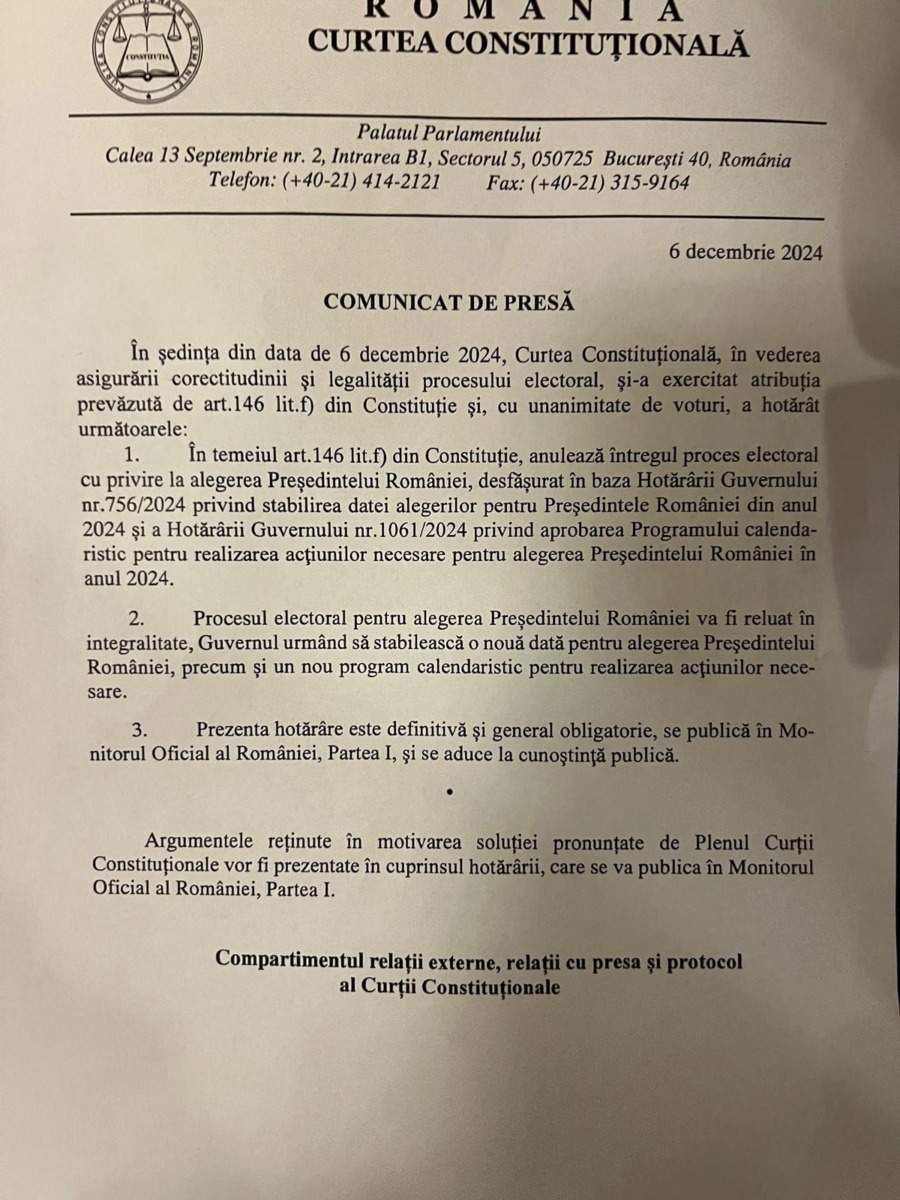 Curtea Constituțională a decis, vineri, în unanimitate, anularea alegerilor prezidențiale, potrivit unui comunicat al CCR. Procesul electoral pentru alegerea președintelui României va fi reluat în integralitate, guvernul urmând să stabilească o nouă dată.