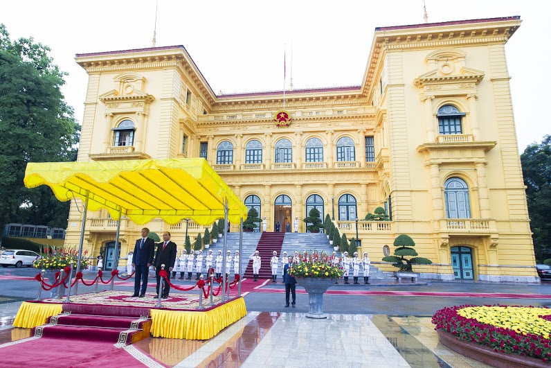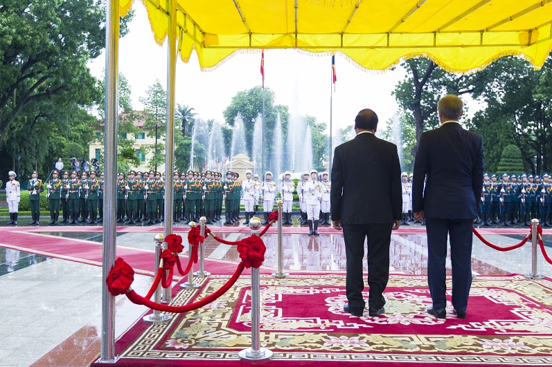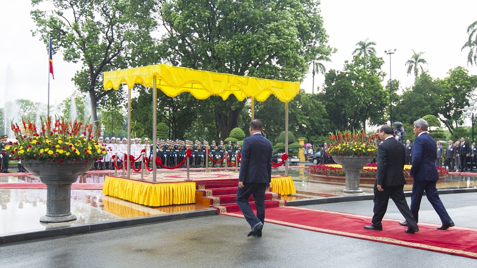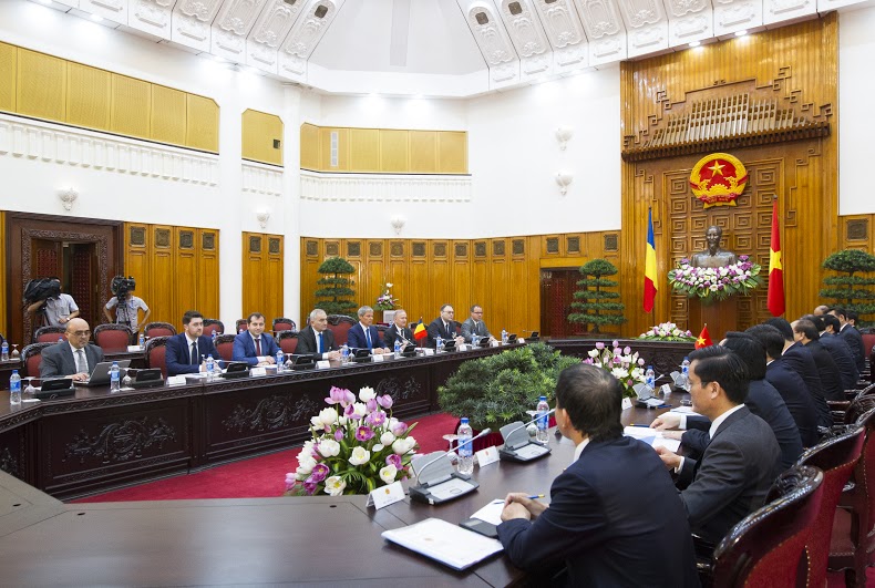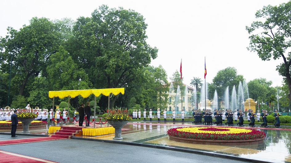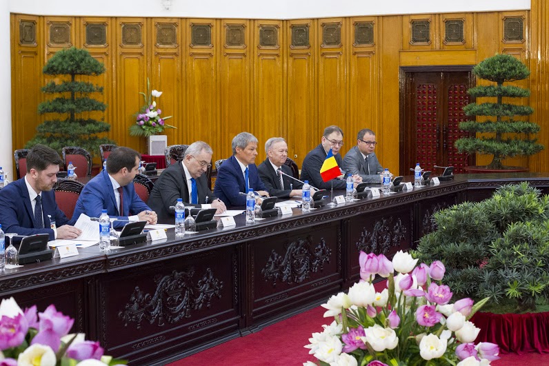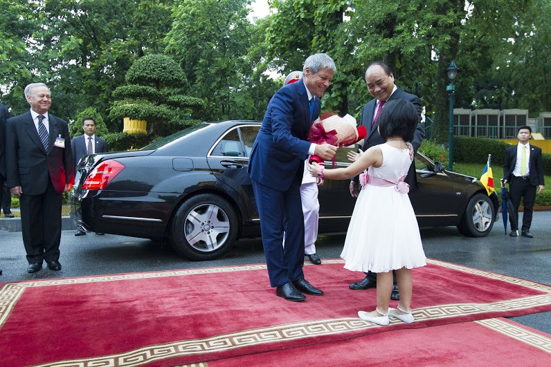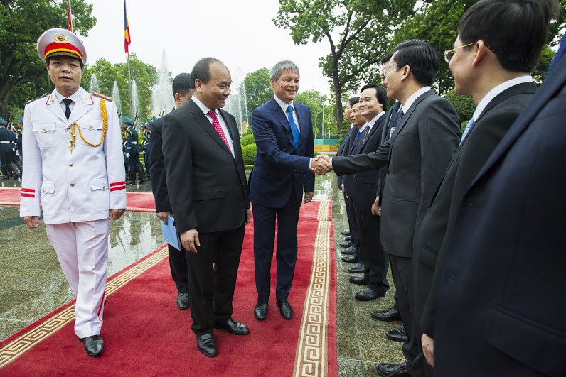 Șeful executivului de la Bucureşti a fost primit de omologul său Nguyễn Xuân Phúc în cadrul unei ceremonii oficiale. Ceremonia depunerii de flori a Monumentul Eroilor şi vizitarea mausoleului preşedintelui Ho şi Min fiind amânate pentru ziua următoare din cauza unei ploi torenţiale. Dacian Cioloş va fi primit astăzi şi de preşedintele republicii Tran Dai Quang şi secretarul Partidului Comunist Nguyễn Phú Trọng. În cadrul discuţiilor va fi analizat stadiul relaţiilor bilaterale, dar şi subiecte de actualitate din plan internaţional şi regional.