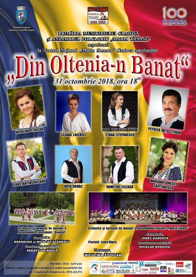 Ansamblul Folcloric „Maria Tănase” organizează miercuri, 31 octombrie, la Teatrul Național „Marin Sorescu”, spectacolul „Din Oltenia-n Banat”, având ca invitat special, în Anul Centenarului Marii Uniri, Ansamblul Profesionist Banatul.