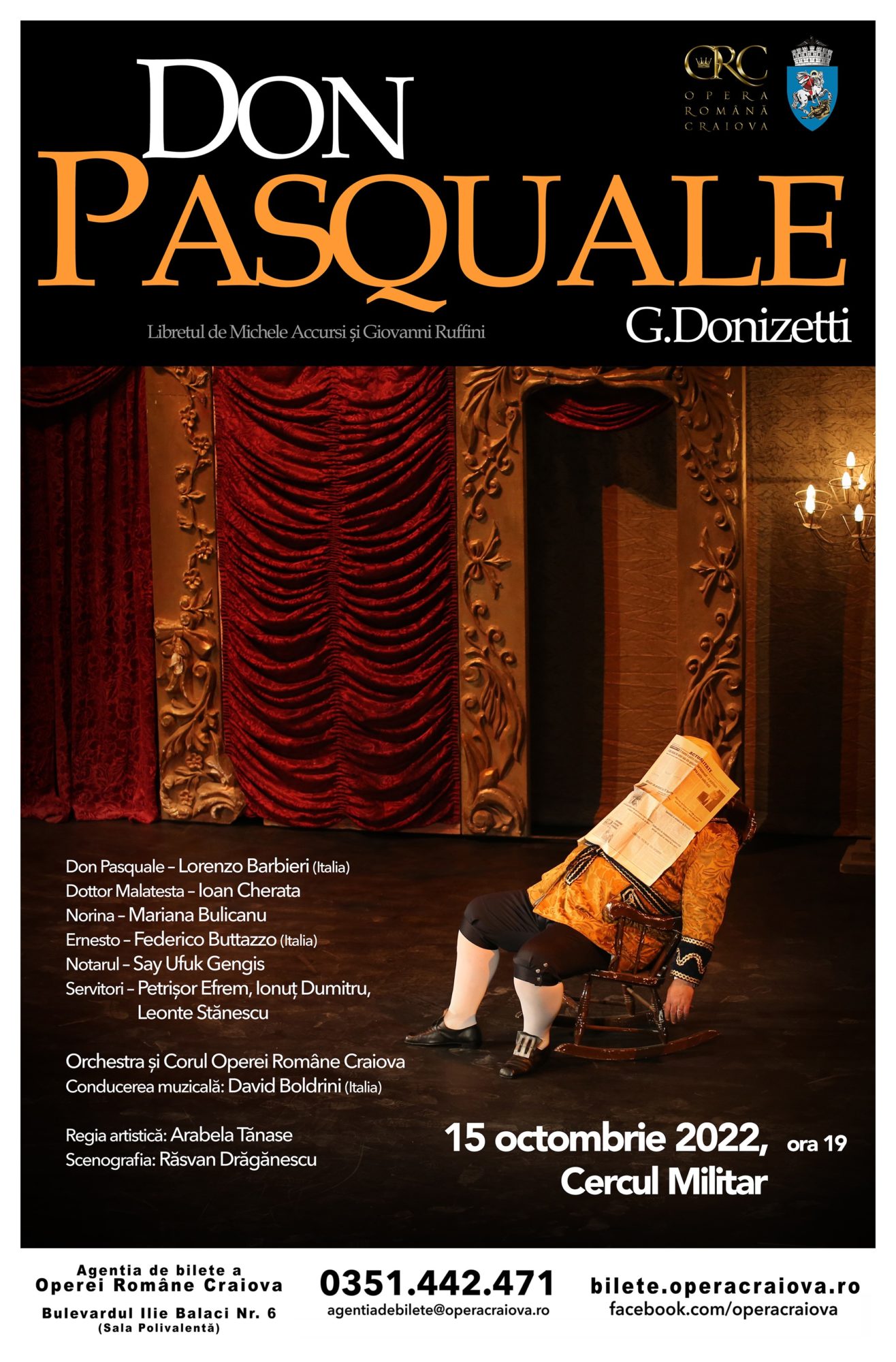 Opera Română Craiova deschide stagiunea 2022-2023 cu spectacolul „Don Pasquale”,sâmbătă, 15 octombrie 2022, începând cu ora 19.00, în sala Cercului Militar Craiova.