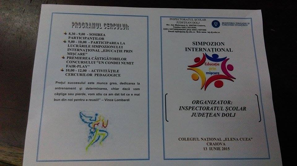 Azi se desfășoară la Colegiul Național Elena Cuza din Craiova cea de-a VI-a ediție a Simpozionului Internațional “Educație prin mișcare”. Organizat de către Inspectoratul Școlar Județean Dolj, simpozionul le permite participanților să exprime, în comunicările prezentate, opinia despre rolul educației prin mișcare. Mai multe amănunte aflați din dialogul purtat de Liliana Hinoveanu Ursu cu prof. Alin Vancea, inspector de specialitate la ISJ Dolj.