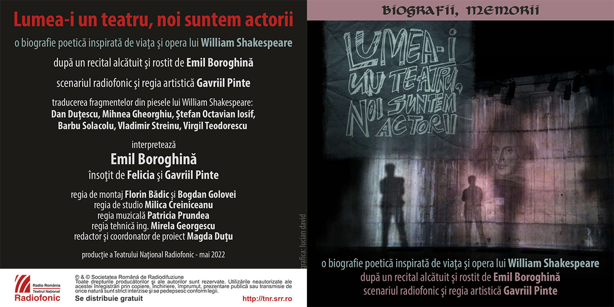 Teatrul Național Radiofonic prezintă în premieră, marți, 5 iulie 2022, de la ora 19:00, la Radio România Cultural – Lumea-i un teatru, noi suntem actorii. O biografie poetică inspirată de viaţa şi opera lui William Shakespeare, după un recital alcătuit şi rostit de Emil Boroghină. Scenariul radiofonic şi regia artistică: Gavriil Pinte. Traducerea fragmentelor din piesele lui William Shakespeare: Dan Duţescu, Mihnea Gheorghiu, Ştefan Octavian Iosif, Barbu Solacolu, Vladimir Streinu, Virgil Teodorescu. În distribuţie: Emil Boroghină, Felicia Pinte, Gavriil Pinte. Regia de montaj: Florin Bădic şi Bogdan Golovei. Regia de studio: Milica Creiniceanu. Regia muzicală: Patricia Prundea. Regia tehnică: ing. Mirela Georgescu. Redactor şi coordonator de proiect: Magda Duţu.