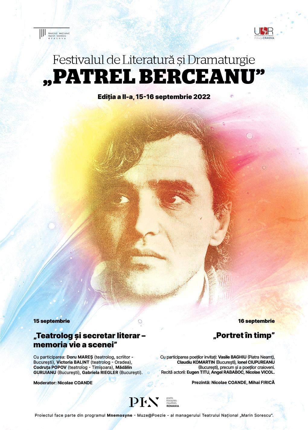 La 16 ani de la plecarea unuia dintre cei mai valoroşi poeţi și intelectuali ai Craiovei, Patrel Berceanu, Teatrul Național „Marin Sorescu” și Filiala Craiova a Uniunii Scriitorilor din România organizează, în perioada 15-16 septembrie 2022, a II-a ediție a Festivalului de literatură și dramaturgie „Patrel Berceanu”. Proiectul este inclus în programul Mnemosyne – Muze@Poezie – al managerului Teatrului Național „Marin Sorescu”.