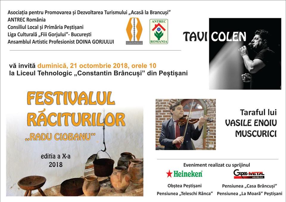 Asociația pentru Promovarea și Dezvoltarea Turismului „Acasă la Brâncuși” și Asociația Națională de Turism Rural, Ecologic și Cultural (ANTREC) România, în parteneriat cu Primăria și Consiliul Local Peștișani, Liga Culturală „Fii Gorjului” și Ansamblul Artistic Profesionist „Doina Gorjului”organizează o nouă ediție a „Festivalului Răciturilor”, în comuna Peștișani.