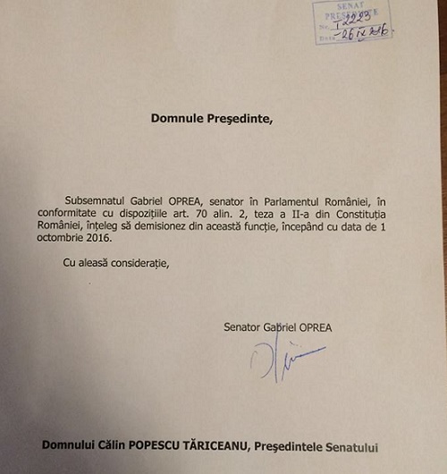 Gabriel Oprea demisionează din Senat începând cu 1 octombrie, el depunând luni la Senat o cerere de demisie.