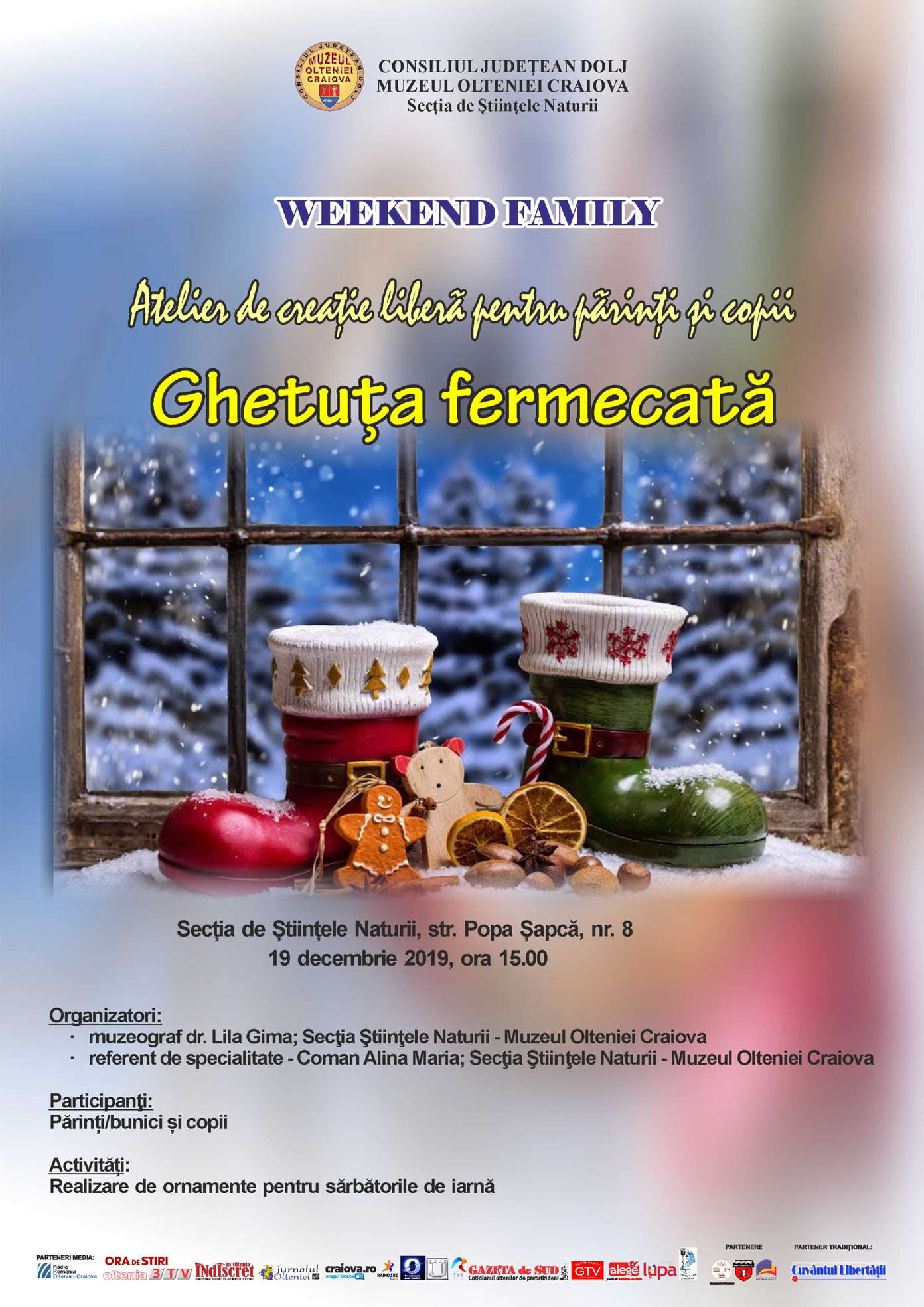 Joi, 19 decembrie 2019, ora 15.00, în spațiul interactiv al Secției de Științele Naturii a Muzeului Olteniei, str. Popa Șapcă nr. 8, dr. Lila Gima, muzeograf, și Coman Alina Maria, referent de specialitate, organizează în cadrul proiectului cultural „Weekend Family”, atelierul de creație liberă pentru părinți și copii – „Ghetuța fermecată”.