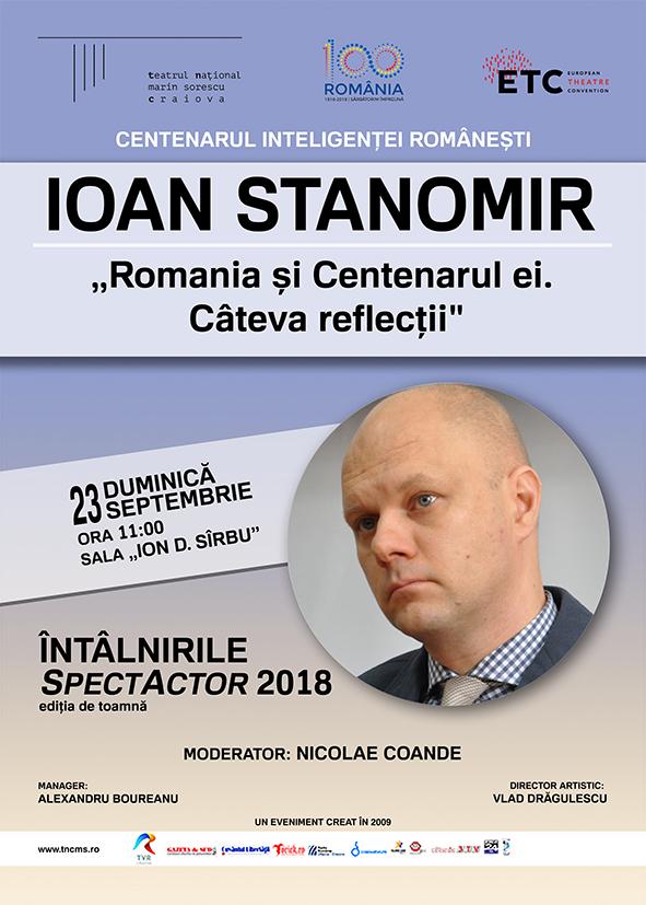 Ioan Stanomir este invitatul lui Nicolae Coande la „Întâlnirile SpectActor”, ediția de toamnă, 2018. Profesor universitar dr. la Departamentul de Științe Politice al Universității din București, preocupat de istoria ideilor, critica literară și constituționalism, reputat analist politic, intelectual public, Ioan Stanomir va susține conferința „România și Centenarul ei. Câteva reflecții” – duminică, 23 septembrie, ora 11, la sala Ia te uită! a Teatrului Național Marin Sorescu Craiova. Conferințele din acest an se desfășoară sub egida România 2018 – Centenarul Inteligenței Românești.