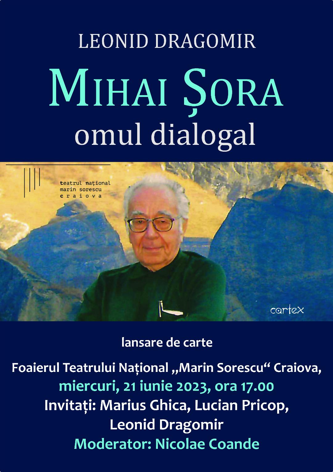 “Mihai Șora. Omul dialogal” este un volum apărut la Ed. Cartex, 2023 (red. șef, Lucian Pricop) și va fi lansat, miercuri, 21 iunie, de la ora 17.00, în prezența autorului, a editorului și a lui Marius Ghica, unul dintre “tinerii amici” ai unui filosof și spirit umanist, care a cultivat intens virtuțile dialogului în cetate.