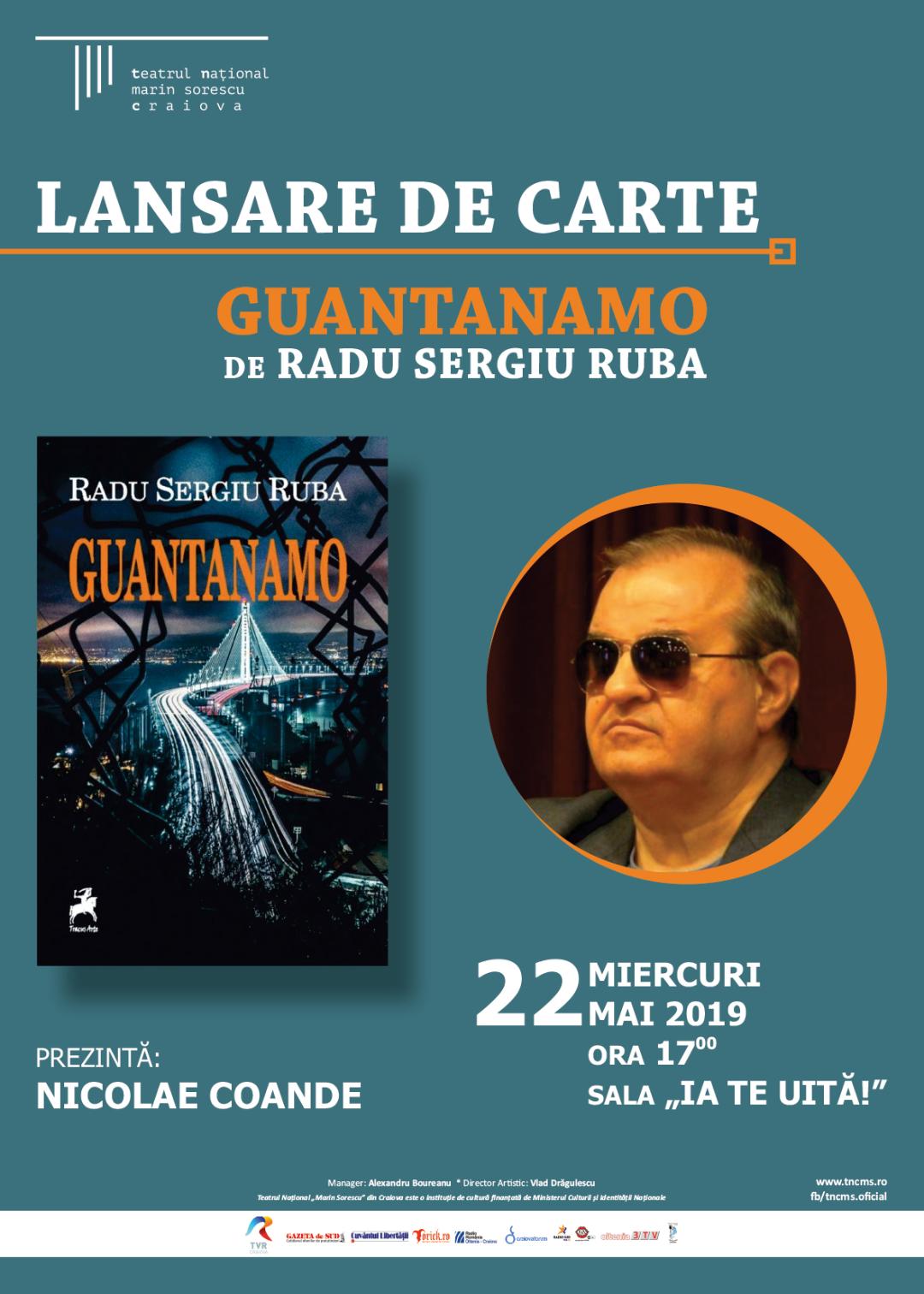 Radu Sergiu Ruba revine la Craiova, la doi ani după dubla lansare de la Teatrul Național „Marin Sorescu”. Miercuri, 22 mai, orele 17:00, în sala „Ia Te Uită” a Naționalului Craiovean, prozatorul vă invită la lansarea romanului „GUANTANAMO”, apărut la finele anului trecut la Editura Tracus Arte. Este povestea evadării, a ascunderii şi exfiltrării, a semiapariţiei şi a speranţelor de scăpare ale Medeei, comisar DIO – Divizia de Investigaţii Operative.