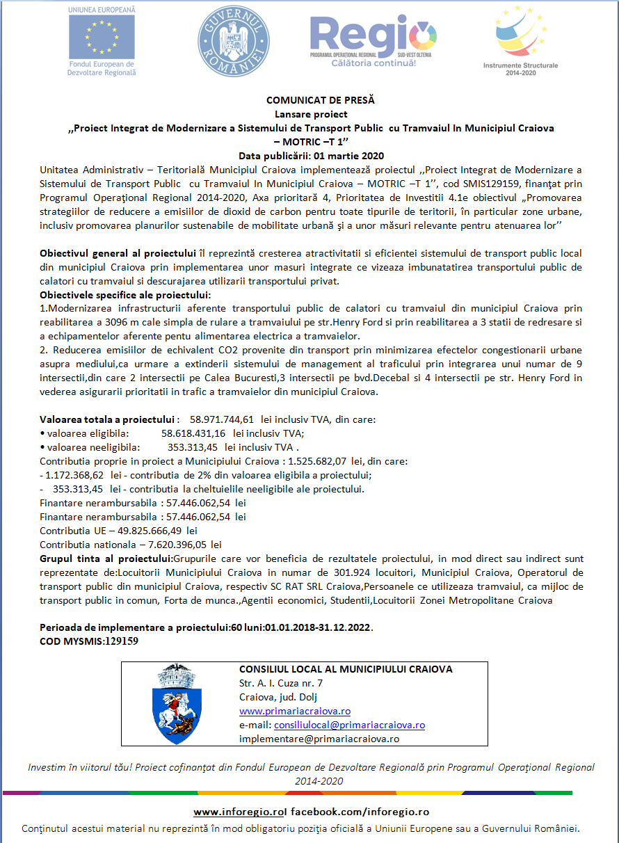 Lansare proiect ,,Proiect Integrat de Modernizare a Sistemului de Transport Public cu Tramvaiul In Municipiul Craiova – MOTRIC –T 1’’