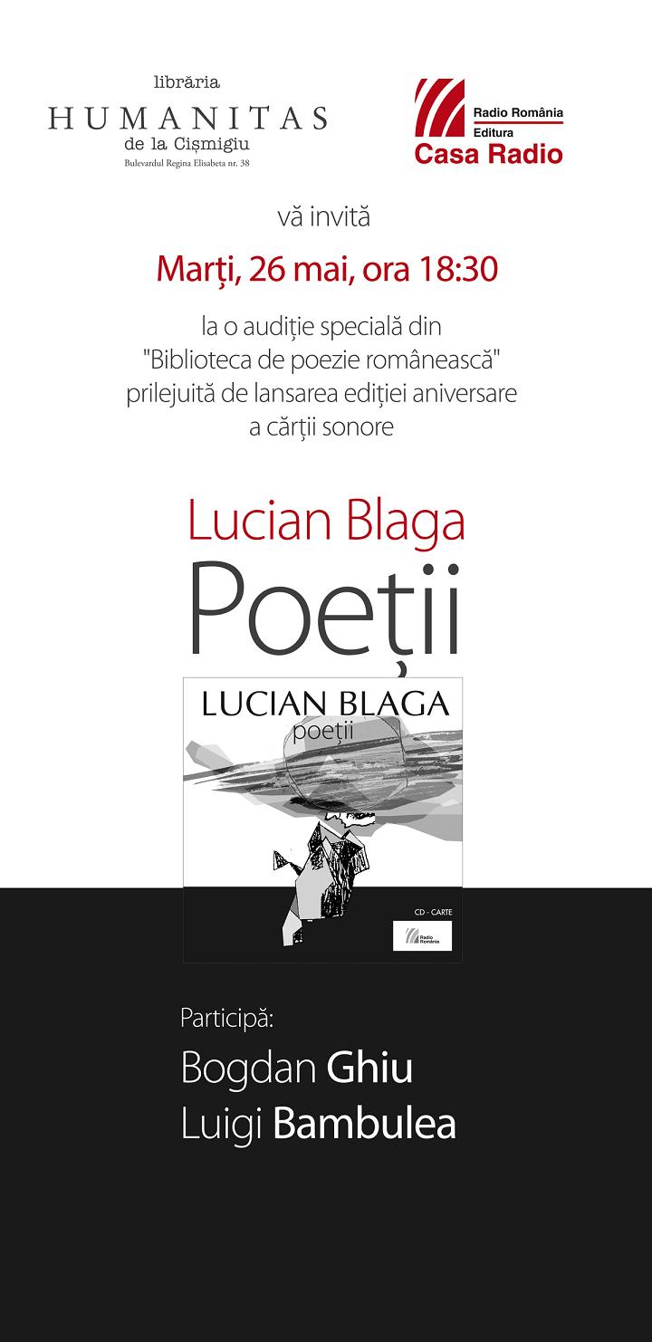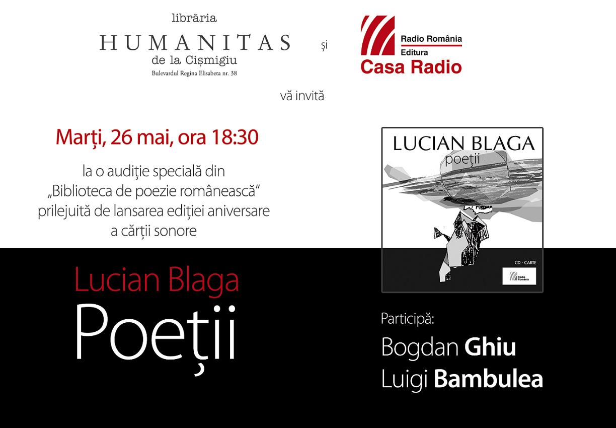 Editura Casa Radio vă invită marţi, 26 mai, la ora 18:30, la o audiţie specială din Biblioteca de Poezie Românească, prilejuită de lansarea ediţiei aniversare a cărţii sonore Lucian Blaga, Poeţii. Evenimentul va avea loc la Librăria Humanitas Cişmigiu (Bd. Regina Elisabeta nr. 38), în prezenţa scriitorului Bogdan Ghiu şi a criticului Luigi Bambulea, care vor intra într-un dialog trans-generaţional.