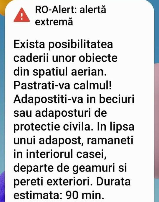 Locuitorii din Tulcea și Constanța au fost avertizați, în noaptea de sâmbătă spre duminică, în privința pericolului căderii unor obiecte din spațiul aerian, ca urmare a unor noi atacuri declanșate de Federația Rusă asupra Ucrainei.
