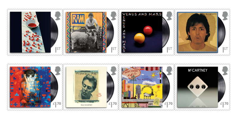 Opt timbre vor prezenta imagini ale copertelor de album, care i-au definit cariera, de la primul său album solo din 1970, „McCartney”, la cel mai recent, „McCartney III”. Celelalte patru, o coliţă în miniatură, vor prezenta fotografii ale acestuia în studioul de înregistrare.