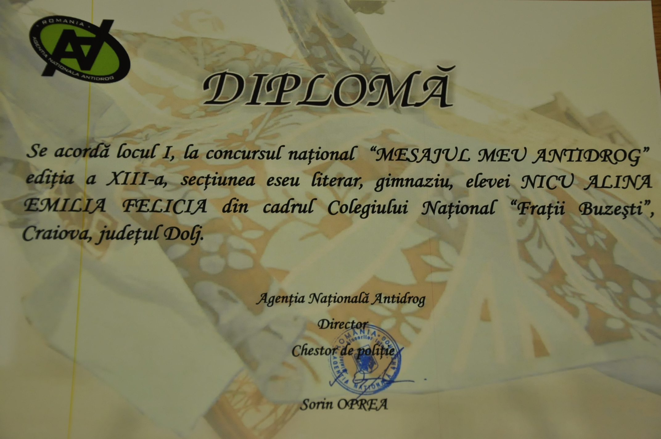 - Tiţă Iuliana Alexandra, de la CN „Fraţii Buzeşti” Craiova, locul III, la secţiunea Spot antidrog, liceu.
