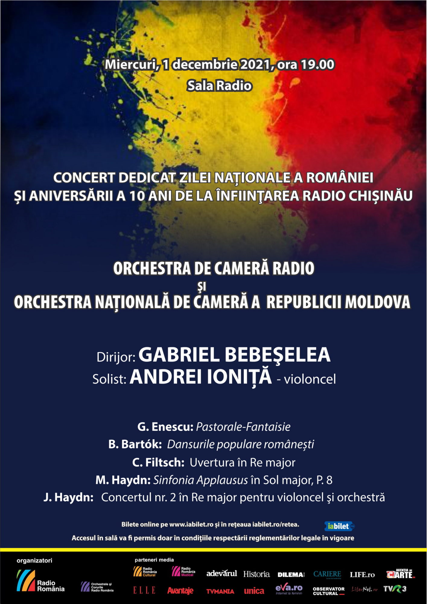 Miercuri, 1 decembrie (ora 19.00), Sala Radio va fi scena unui eveniment extraordinar, ce marchează o dublă aniversare: Ziua Națională a României, dar și 10 ani de emisie a postului Radio Chișinău, parte a portofoliului Radio România. Cu acest prilej deosebit, muzicieni din cele două țări se vor reuni pentru a dărui publicului un concert simfonic de înalt nivel artistic: pe scena Sălii Radio va cânta Orchestra de Cameră Radio, alături de membri ai Orchestrei Naţionale de Cameră a Republicii Moldova.