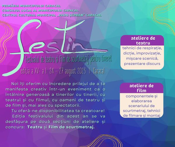 Centrul Cultural ”Radu Șerban” din Caracal, județul Olt, organizează, în perioda 24 – 26 august, a XV-a ediție a Festivalul de Teatru și Film de scurtmetraj pentru Tineret, pe scurt, fesTin. Timp de patru zile, la Teatrul Național din Caracal, vor avea loc workshop-uri, susținute de nume importante din lumea teatrului și a filmului. Totodată, se va desfășura concursul dedicat liceenilor (clasele IX-XII), care se vor întrece la două secțiuni: teatru și film de scurtmetraj. Tema din acest an este ”Atracție”.