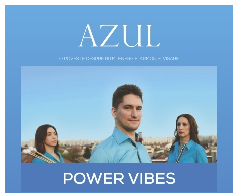 Un trio cameral unic în România, Power Vibes reprezintă întâlnirea artistică a trei muzicieni care aduc pe scenă o combinație sonoră exotică, între instrumentele de percuție și flaut. Proiectul Azul s-a concretizat printr-un album editat în această primăvară și un turneu național în cinci orașe din România: 23 aprilie, Râșnov — Piața Unirii, 24 aprilie, Ploiești — Filarmonica ‘Paul Constantinescu’, 25 aprilie — Sala Radio, 7 mai, Sibiu — Sala Thalia, 8 mai, Cisnădie — Biserica Evanghelică Fortificată.