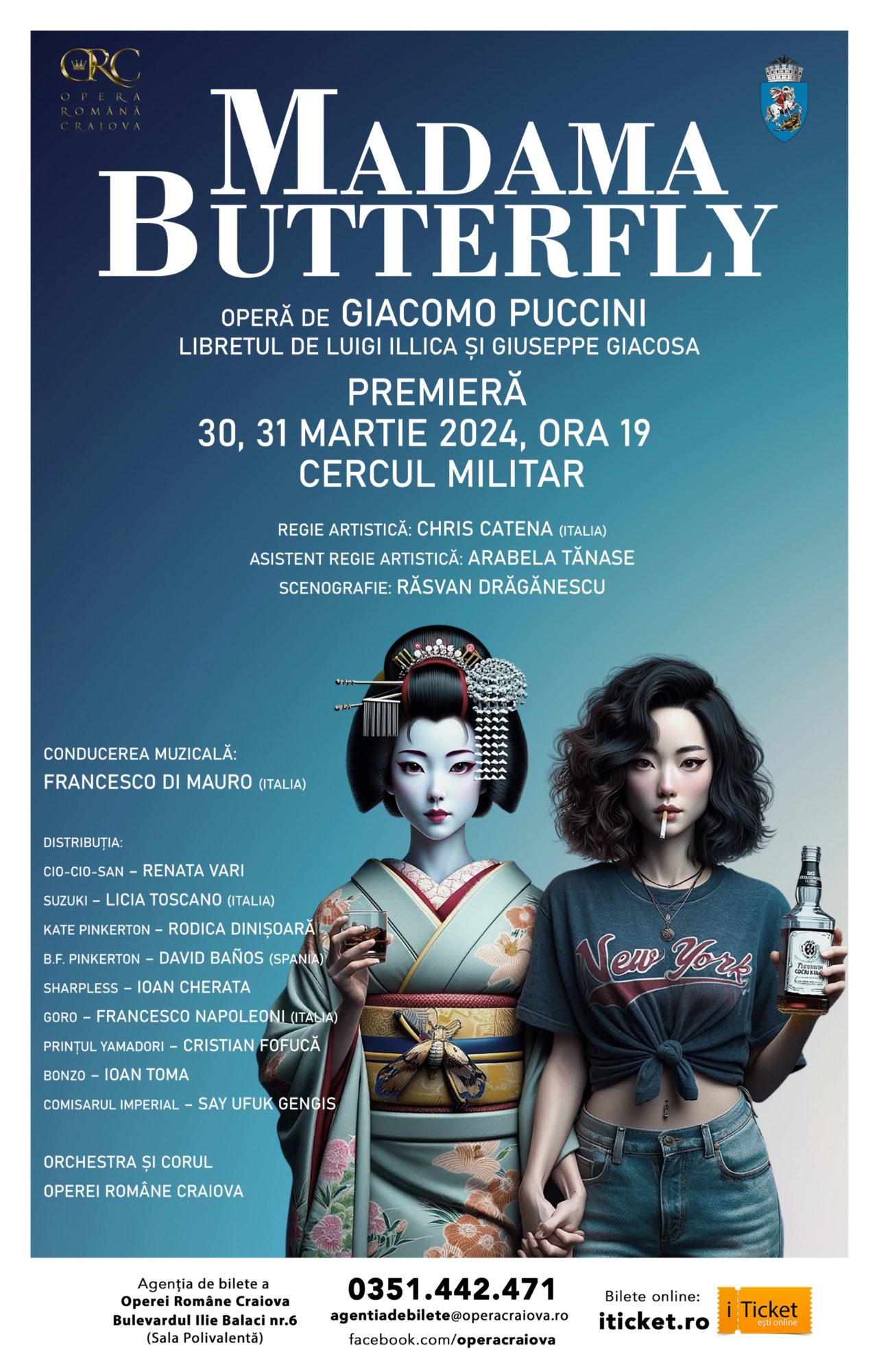 Emoționanta poveste va fi interpretată de artiștii Renata Vari (Cio-Cio-San), Licia Toscano (Suzuki), Rodica Dinișoară (Kate Pinkerton), David Baños (B.F. Pinkerton), Ioan Cherata (Sharpless), Francesco Napoleoni (Goro), Cristian Fofucă (Prințul Yamadori), Ioan Toma (Bonzo), Say Ufuk Gengis (Comisarul imperial) și Orchestra și Corul Operei Române Craiova, sub conducerea muzicală a dirijorului italian Francesco di Mauro.