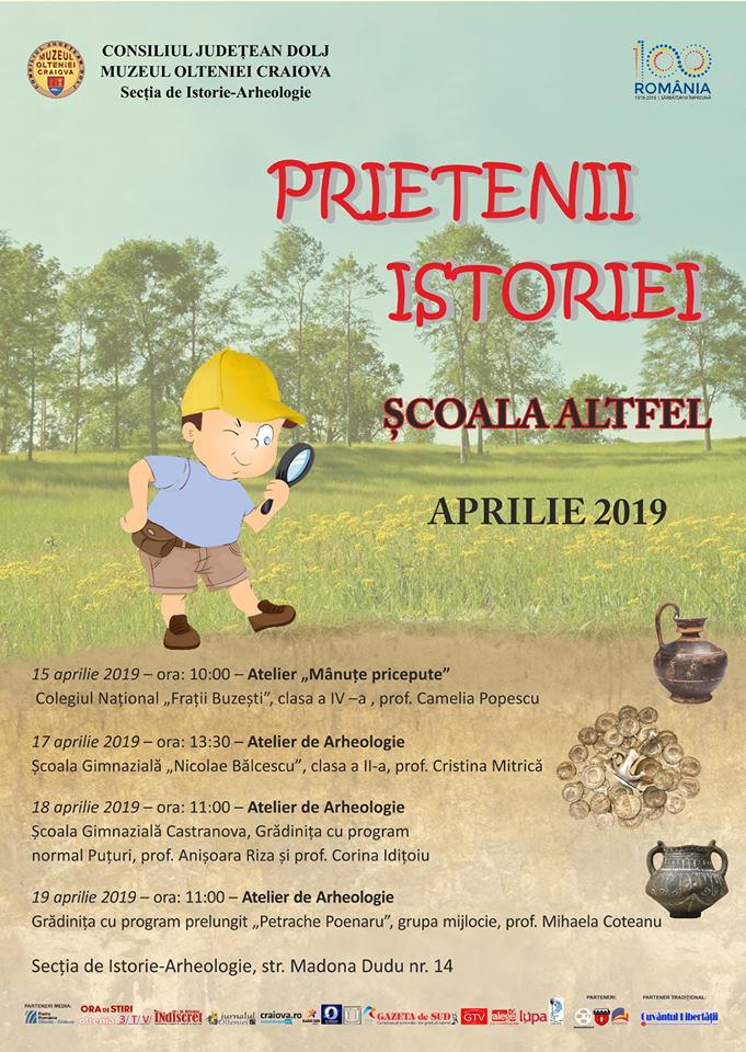 Muzeul Olteniei prin Secția de Istorie-Arheologie a pregătit, sub semnul programului educativ „Școala Altfel”, evenimente culturale și ateliere de creație pe placul celor mici. Astfel, în perioada 15 – 19 aprilie 2019, muzeografii implicați în programul „Școala Altfel”, vor derula atelierele de arheologie și “Mânuțe Pricepute” la care vor participa unități școlare și preșcolare din Craiova și din județul Dolj.