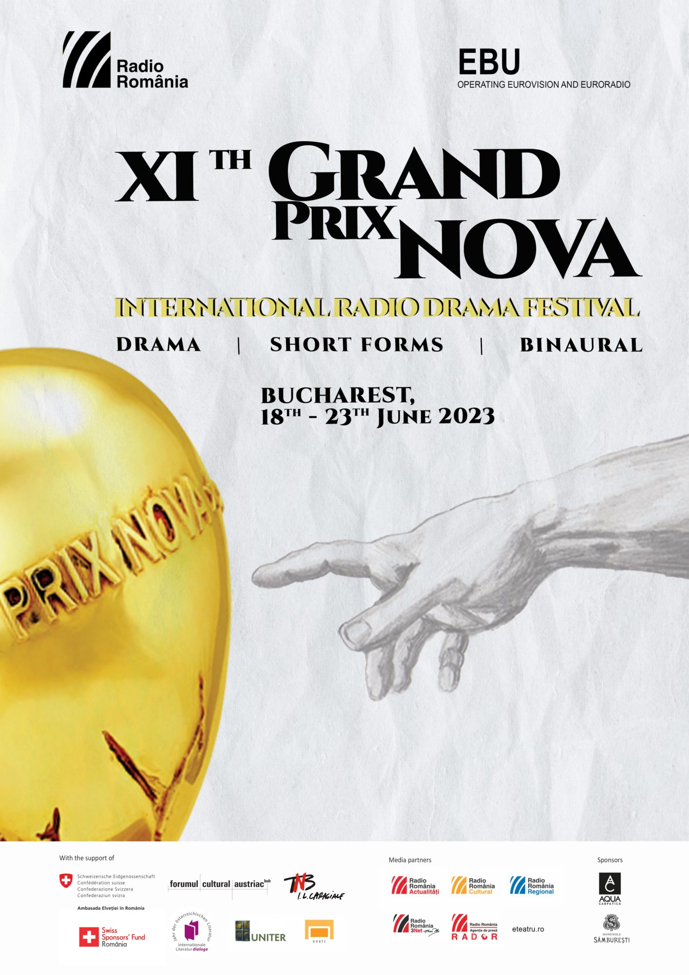 În perioada 18-23 iunie, Radio România organizează a XI-a ediție a Festivalului Internaţional de Teatru Radiofonic Grand Prix Nova, dedicat inovaţiei în creaţia de teatru radiofonic, găzduit de sala de spectacole a Teatrelli Bucureşti (Piața Lahovari, nr. 7).