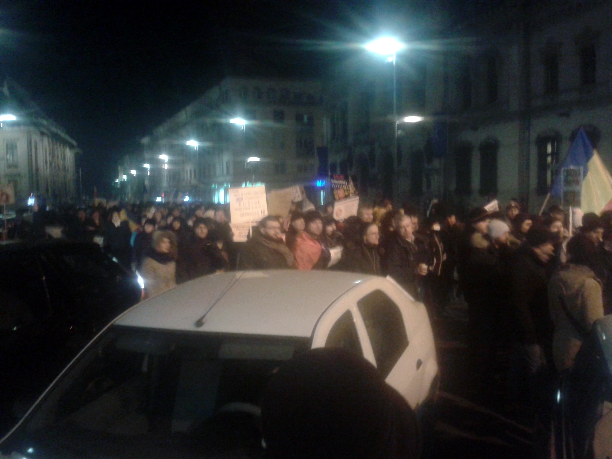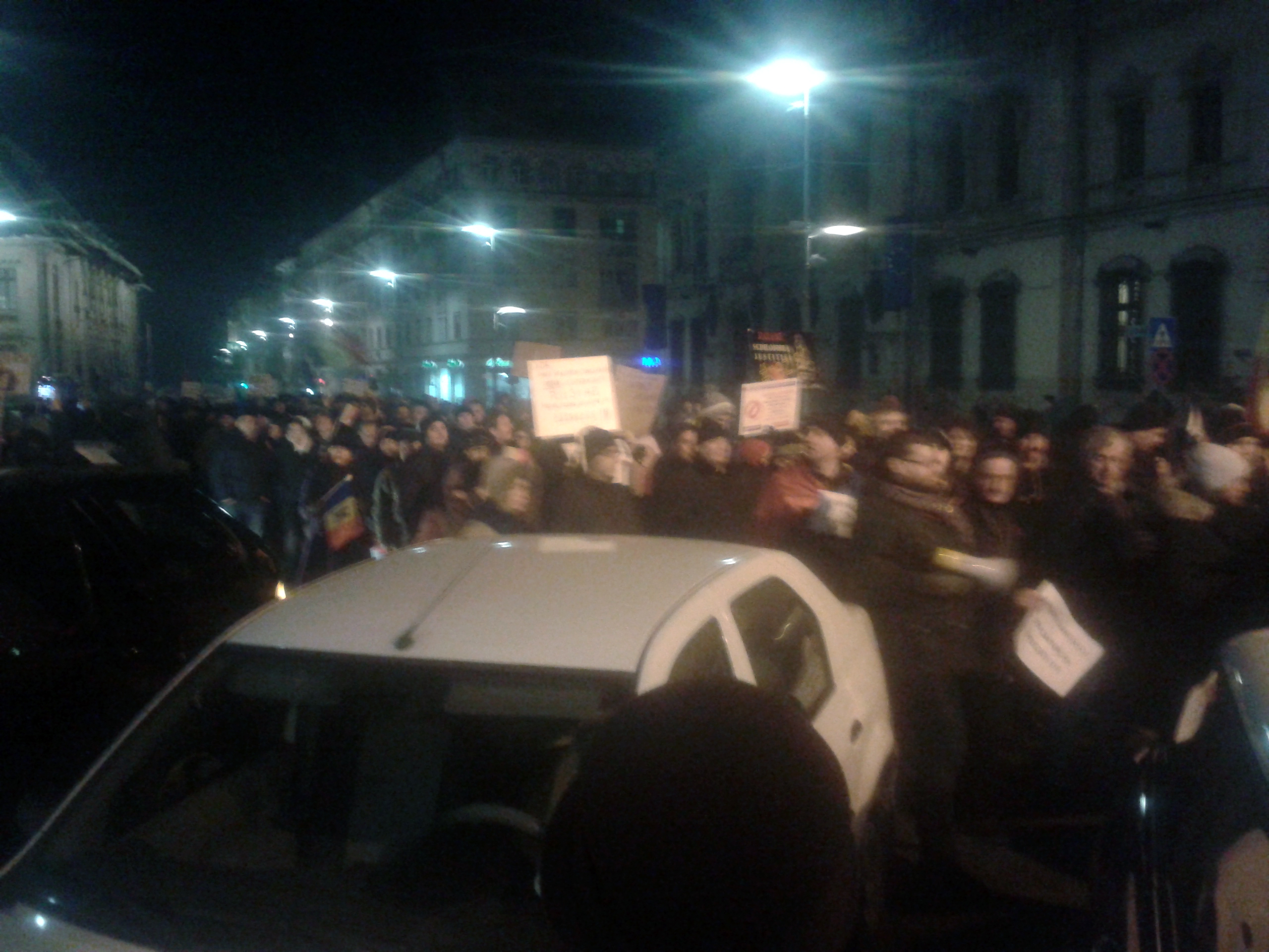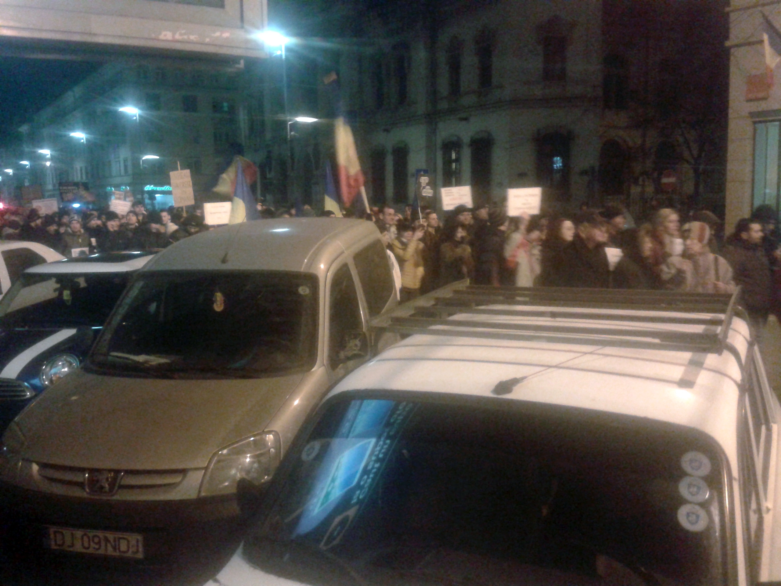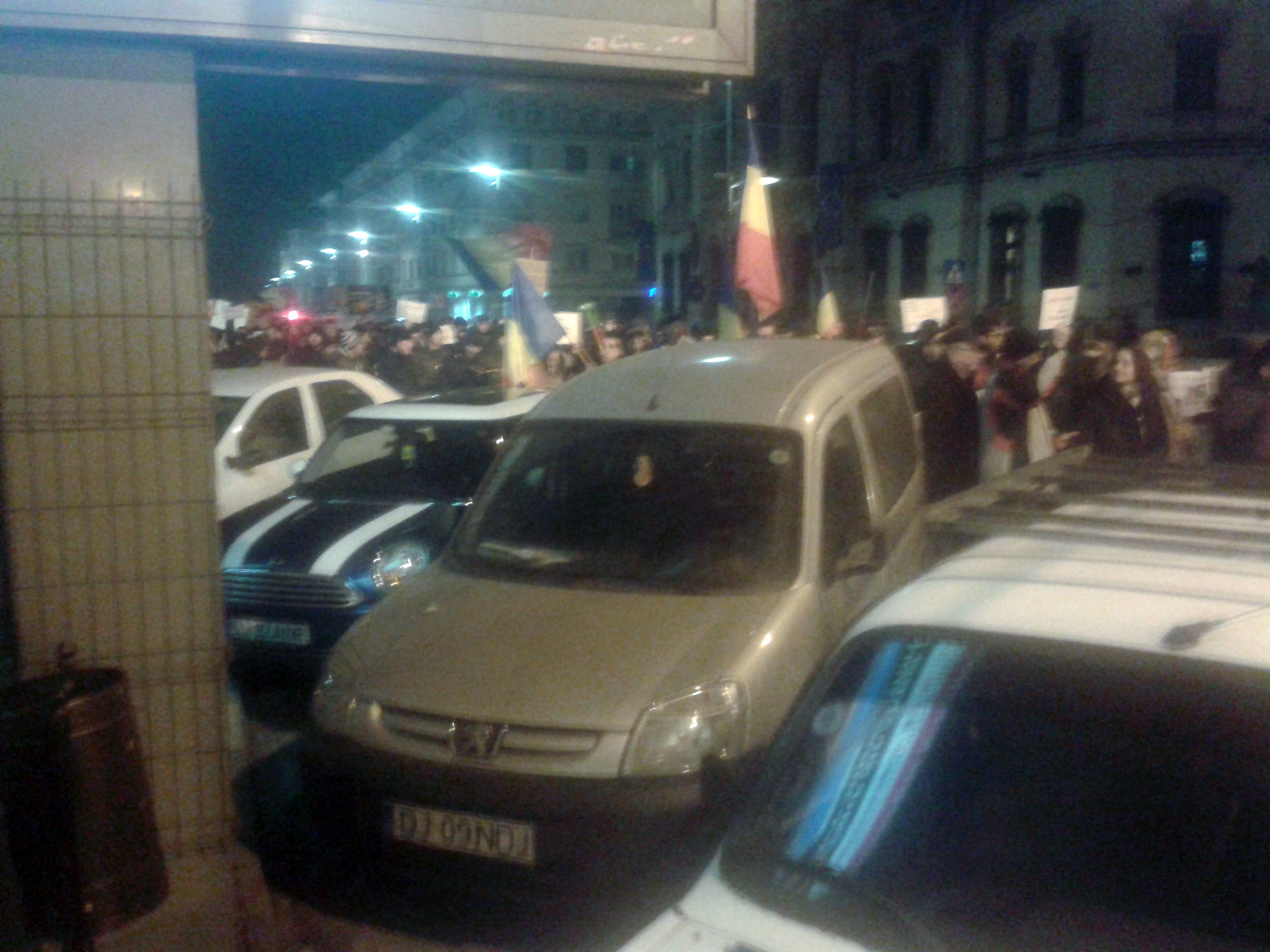 Astă-seară Craiova s-a mobilizat din nou. Circa 10.000 de oameni în stradă. Cred că apreciez corect, pentru că pe un traseu de aproape 500 de metri, între Universitate și Piața Mihai Viteazu, strada a fost complet ocupată! După ce și-au dat întâlnire la Prefectură, manifestanții au pornit către Calea București.