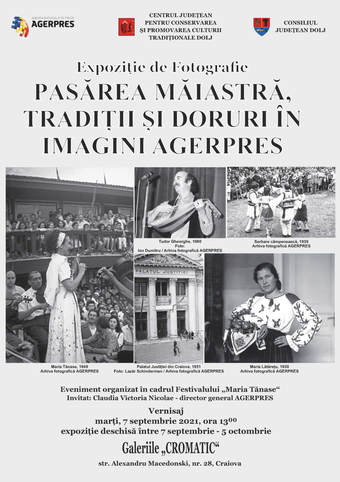 Marți, 7 septembrie, la ora 13.00, Agenția de presă Agerpres, în parteneriat cu Centrul Județean pentru Conservarea şi Promovarea Culturii Tradiționale Dolj, vernisează, la Galeriile „Cromatic“, expoziția de fotografie „Pasărea Măiastră, tradiții și doruri în imagini AGERPRES“, expoziție ce conține 30 de fotografii de arhivă și din fluxul foto, realizate, de-a lungul timpului, de fotoreporterii agenției.