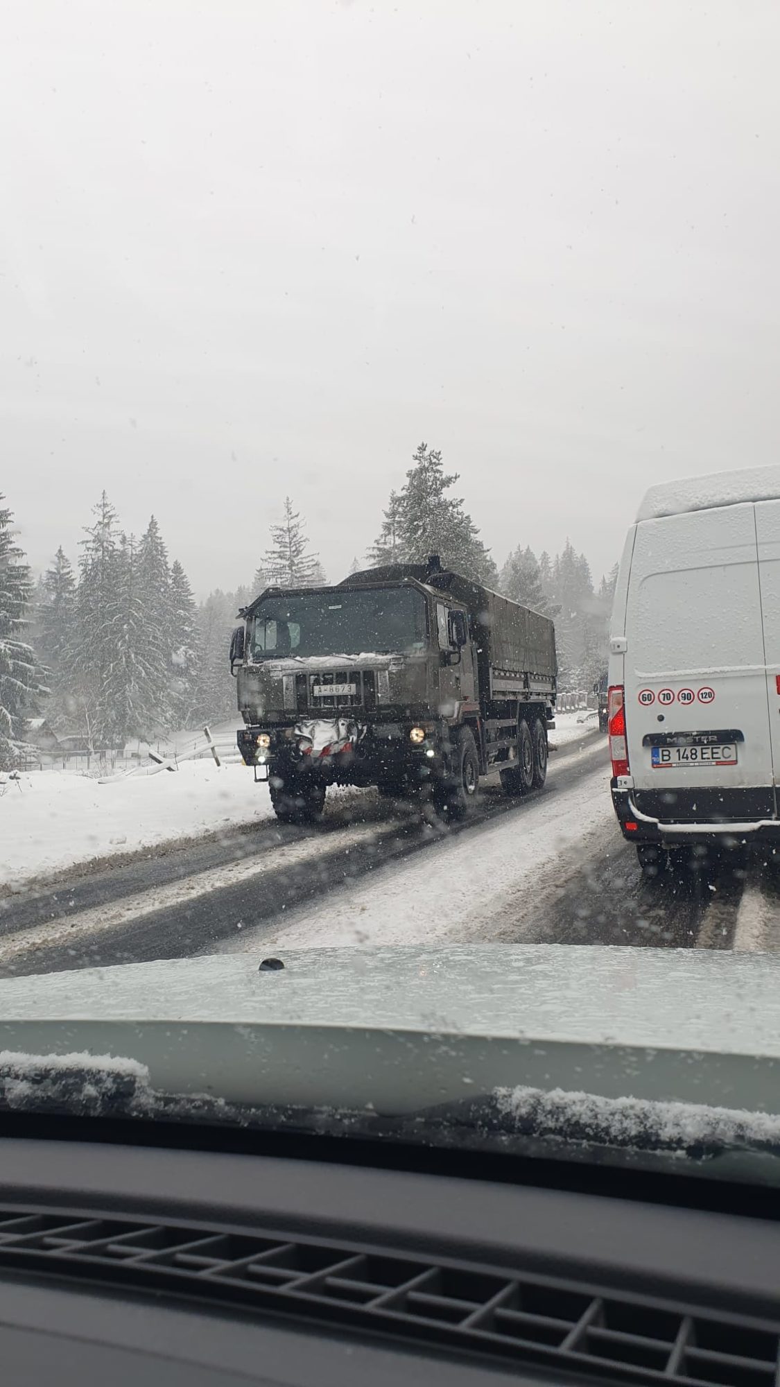 Ninge abundent pe DN 17 Bistrița-Vatra Dornei, în localitatea Piatra Fântânele (Pasul Tihuța), județul Bistrița-Năsăud, mai multe autotrenuri nu pot înainta, astfel că sensul de urcare este oprit și se circulă alternativ, pe celălalt fir.