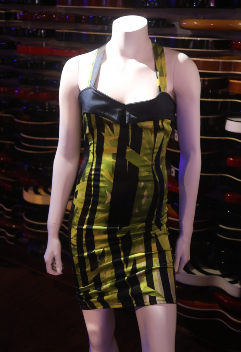 Winehouse a purtat această rochie neagră, cu imprimeu de bambus, la un concert susţinut la Belgrad, în iunie 2011. O lună mai târziu, pe 23 iulie, Amy Winehouse a murit, în casa ei, din Londra, din cauza unei supradoze. Ea avea 27 de ani şi se luptase cu dependenţa de alcool şi droguri.