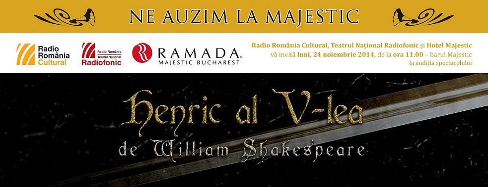 Selecţiuni din spectacolul radiofonic Henric al V-lea, de William Shakespeare, în regia lui Attila Vizauer, vor putea fi audiate, în avanpremieră, luni, 24 noiembrie, la ora 11:00, la clubul de la hotelul Ramada Majestic de pe Calea Victoriei din Bucureşti.