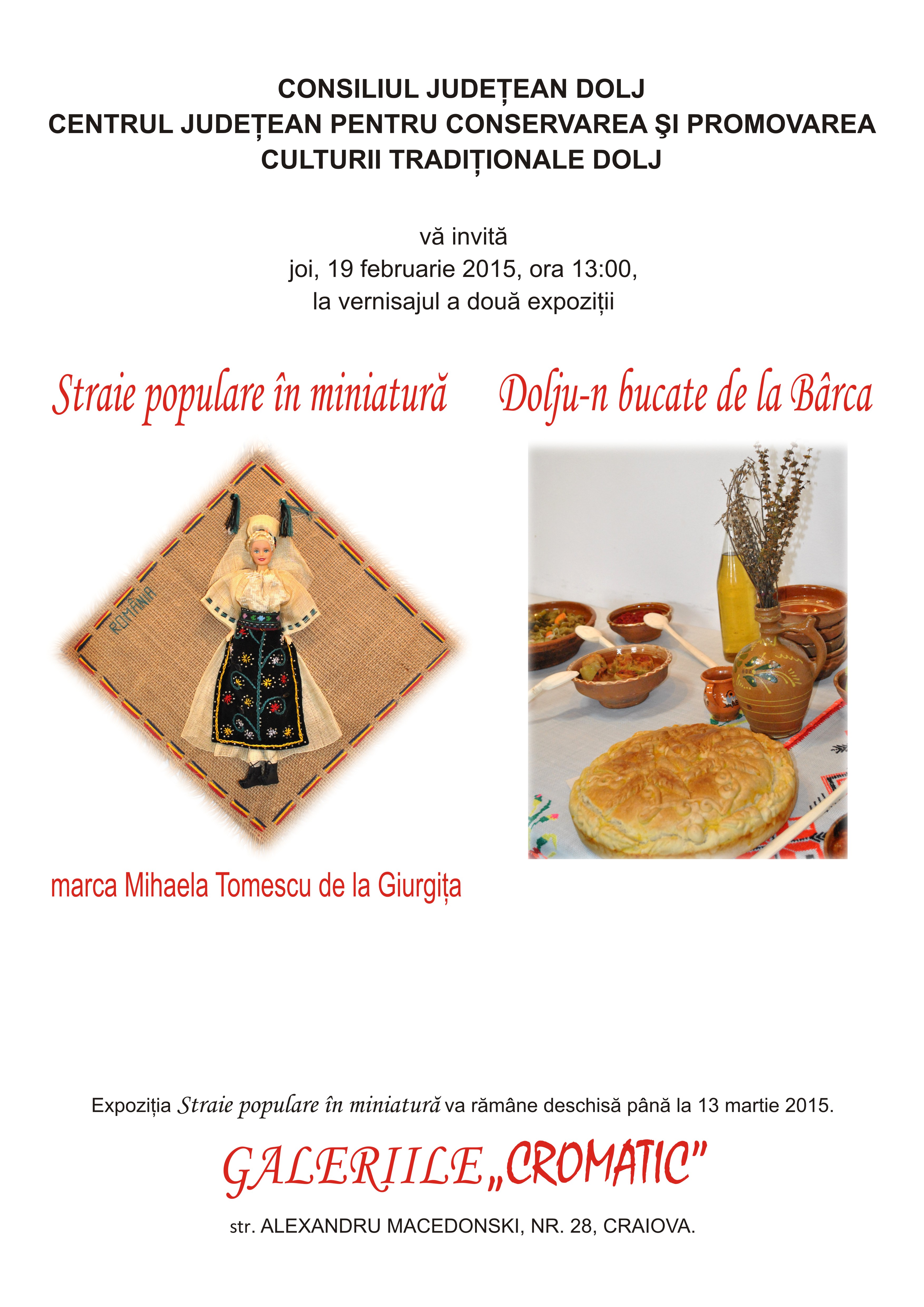 Centrul Judeţean pentru Conservarea şi Promovarea Culturii Tradiţionale Dolj vă invită joi, 19 februarie 2015, ora 13:00, la vernisajul a două expoziţii ce promovează arta tradiţională din judeţul Dolj.