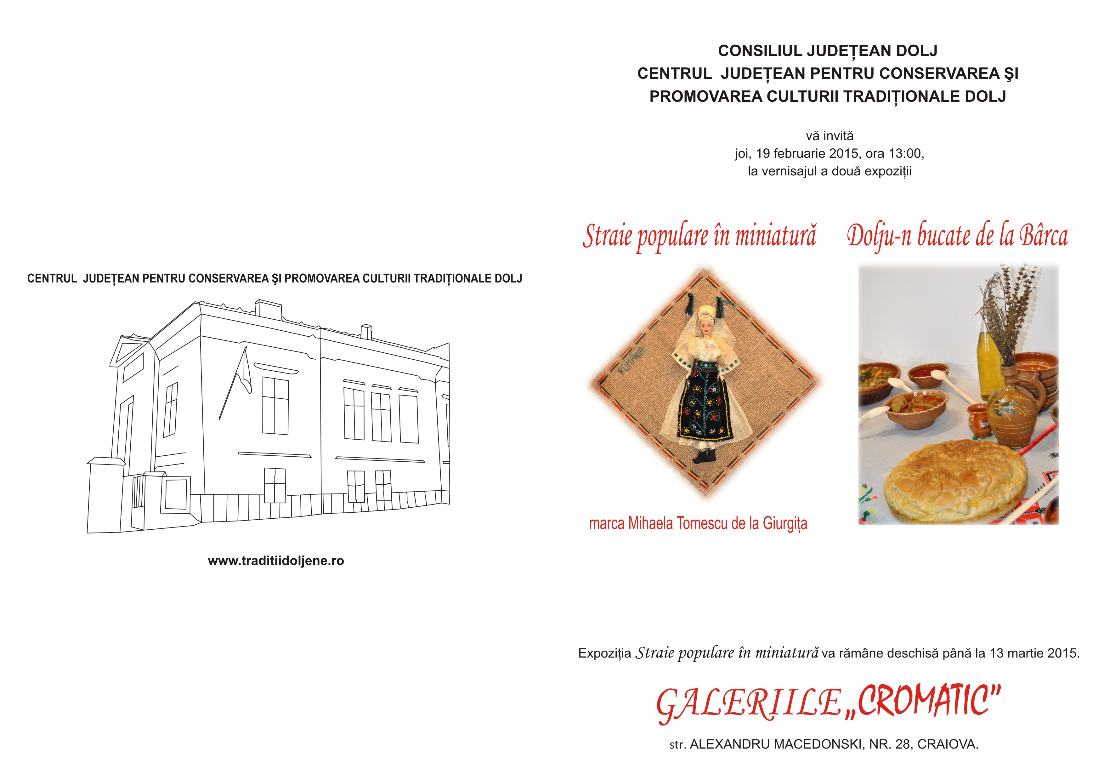 Expoziţia Straie populare în miniatură va rămâne deschisă la Galeriile “Cromatic” din cadrul Centrului Judeţean pentru Conservarea şi Promovarea Culturii Tradiţionale Dolj până la 13 martie 2015.